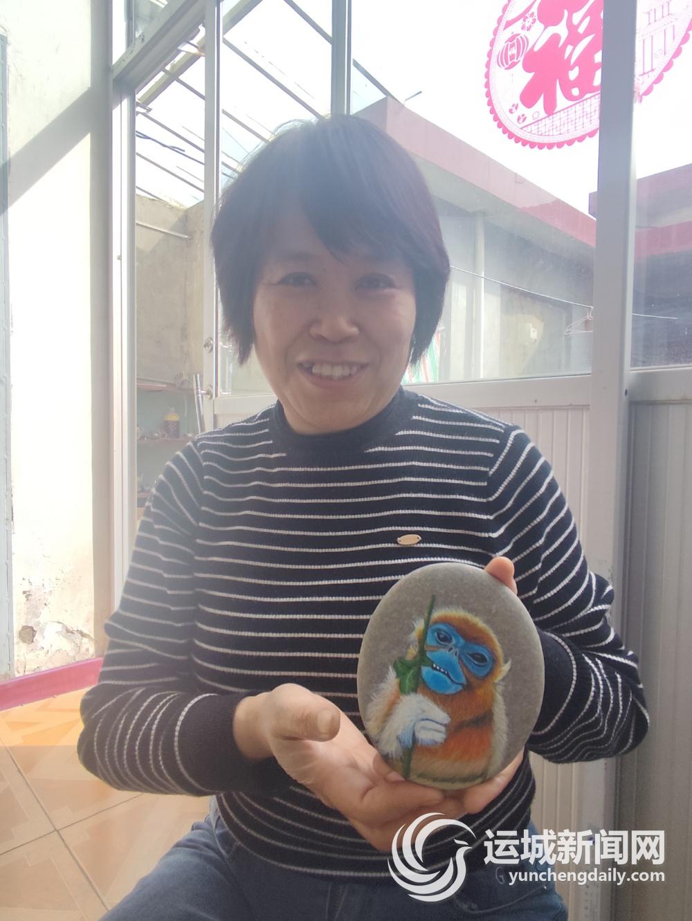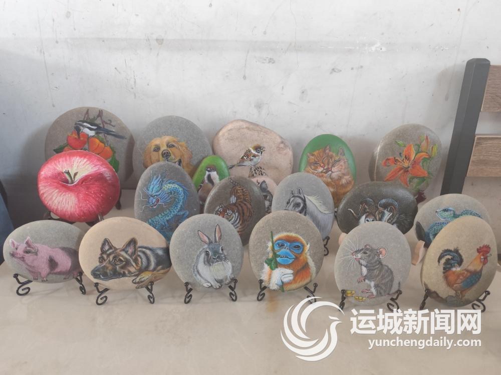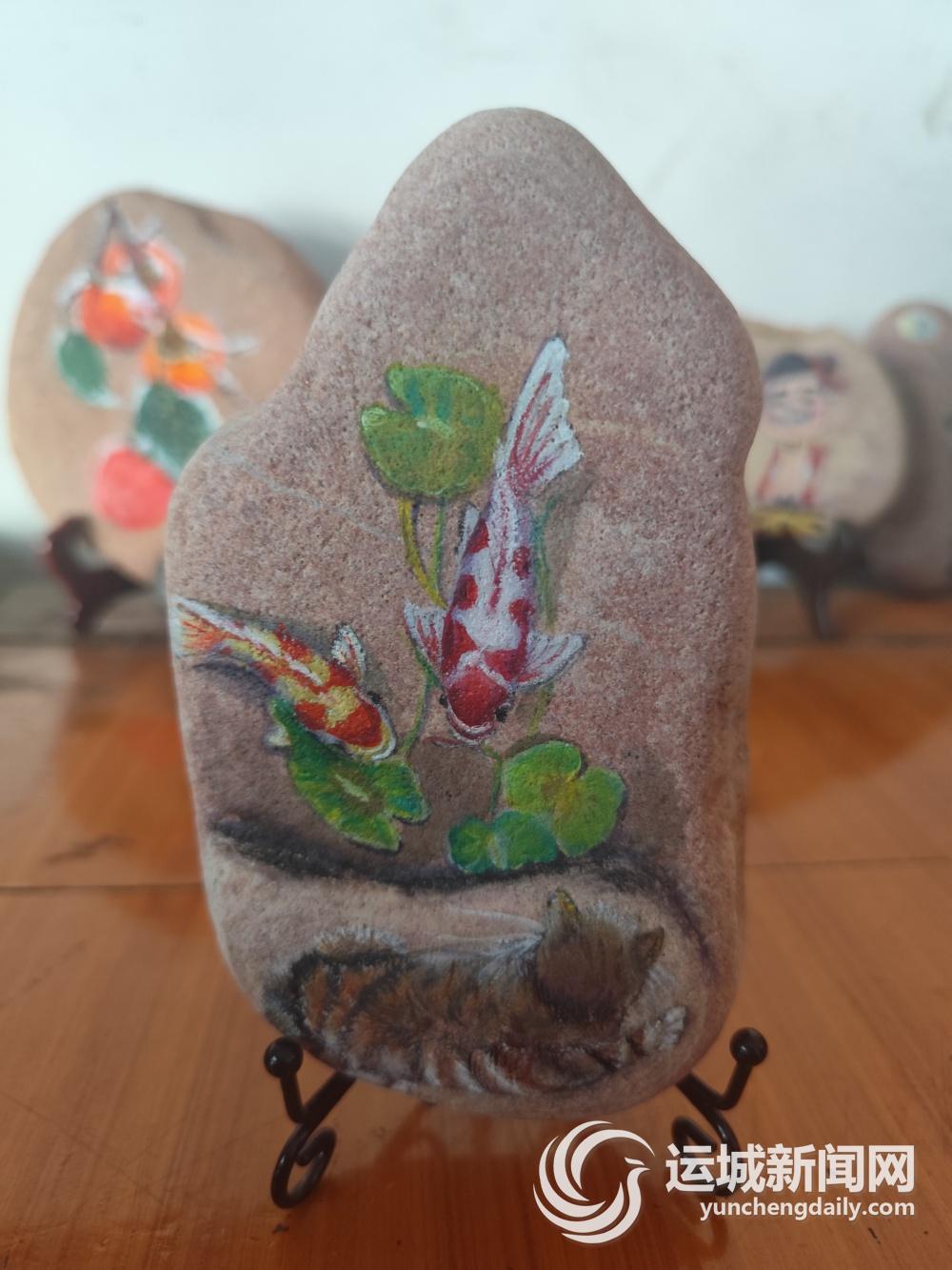 一次偶然的机会,杨爱平在网上看到石头画,从此便深陷其中,业余时间都献给了这个爱好。此后,她看见石头就想捡回家创作,垣曲的黄河石便是重要“画板”。黄河石因当地自然环境影响,自带花纹且质地粗糙,但这反而激发了她的灵感。比如一块不平整、下方有凸起的石头,凸起处被她化作河岸,上面画小猫,凹处则成了小河,几条小鱼游弋其中,一幅小猫馋鱼的趣味画面跃然石上。