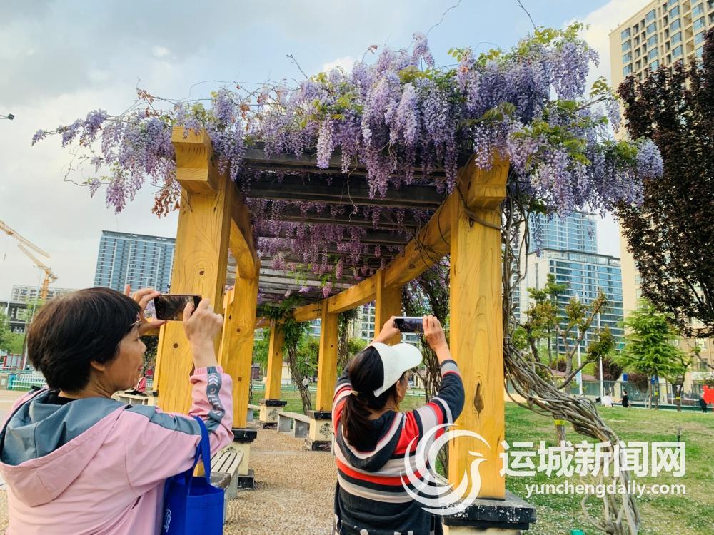 4月9日,中心城区体育公园紫藤花开正艳,吸引游园市民驻足欣赏。