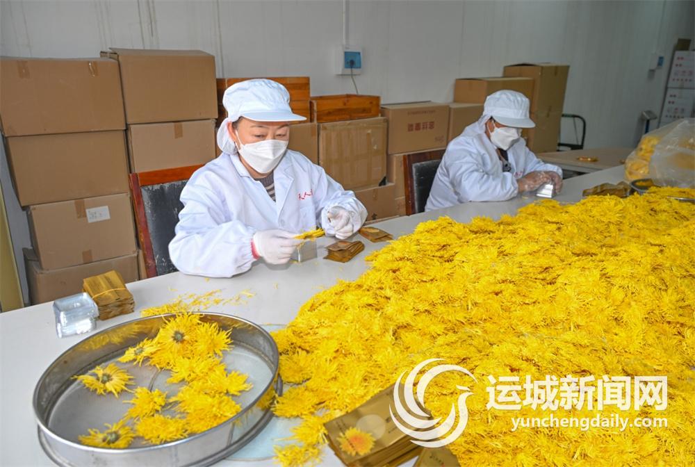 4月9日,芮城县一公司生产车间内,工人在包装金丝皇菊。