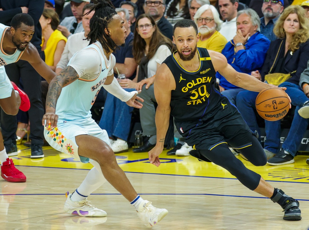 4月9日,勇士队球员库里(右)在比赛中进攻。