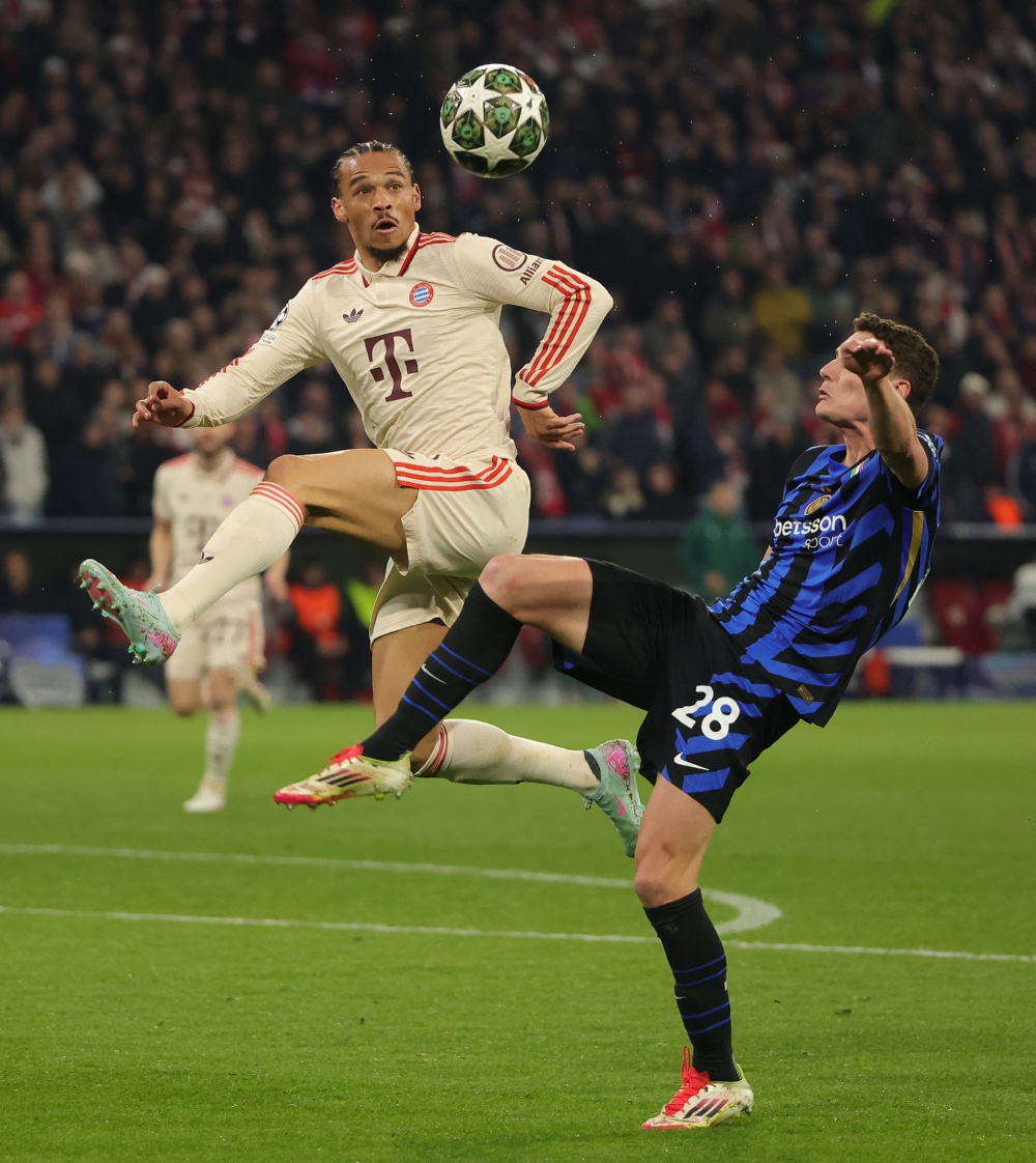 4月8日,拜仁慕尼黑队球员萨内(左)与国际米兰队球员帕瓦尔在比赛中拼抢。