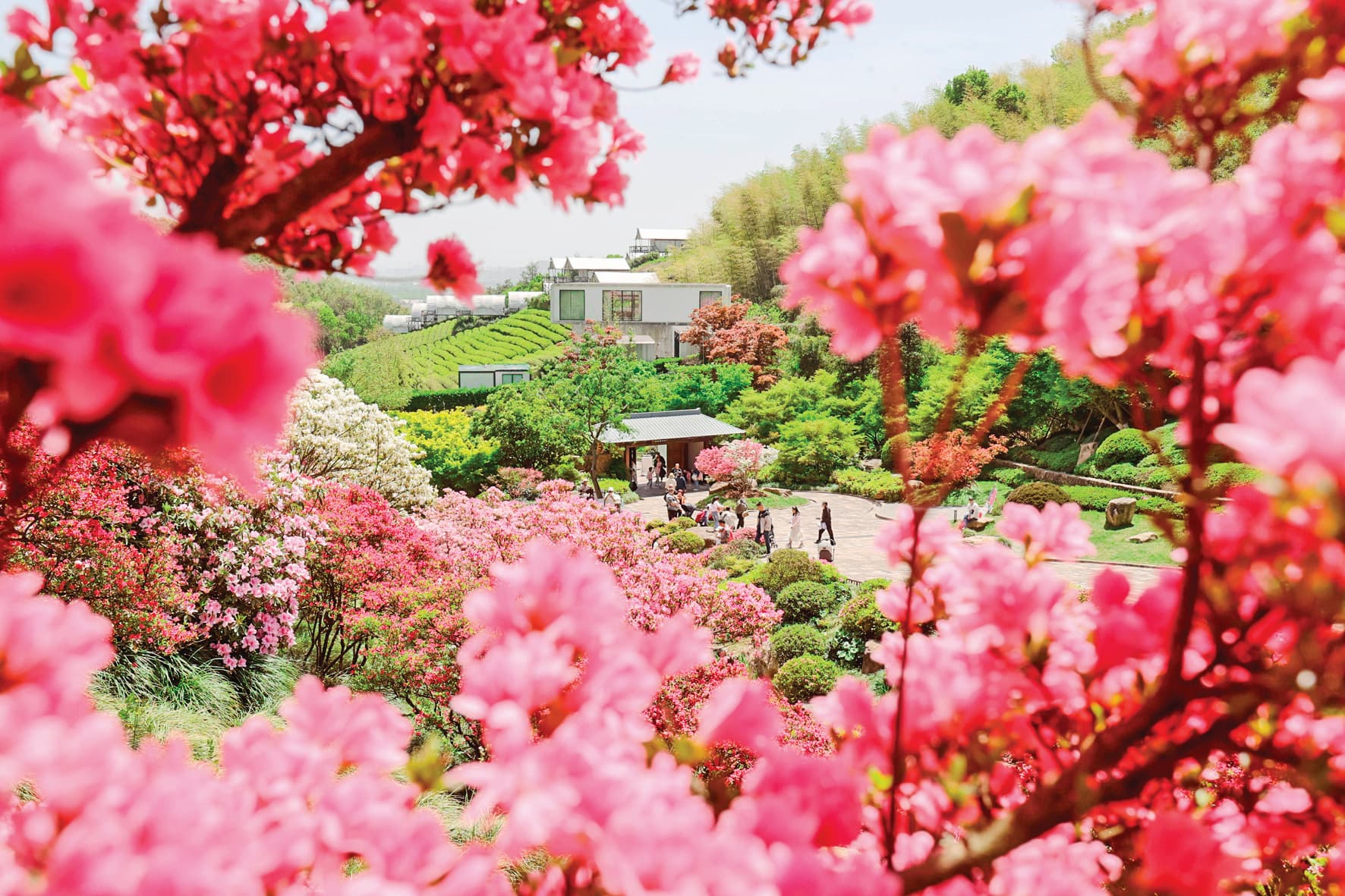 4月13日,游客在浙江省湖州市德清县下渚湖奇幻谷杜鹃花海中漫步游玩。 新华社发(谢尚国 摄)