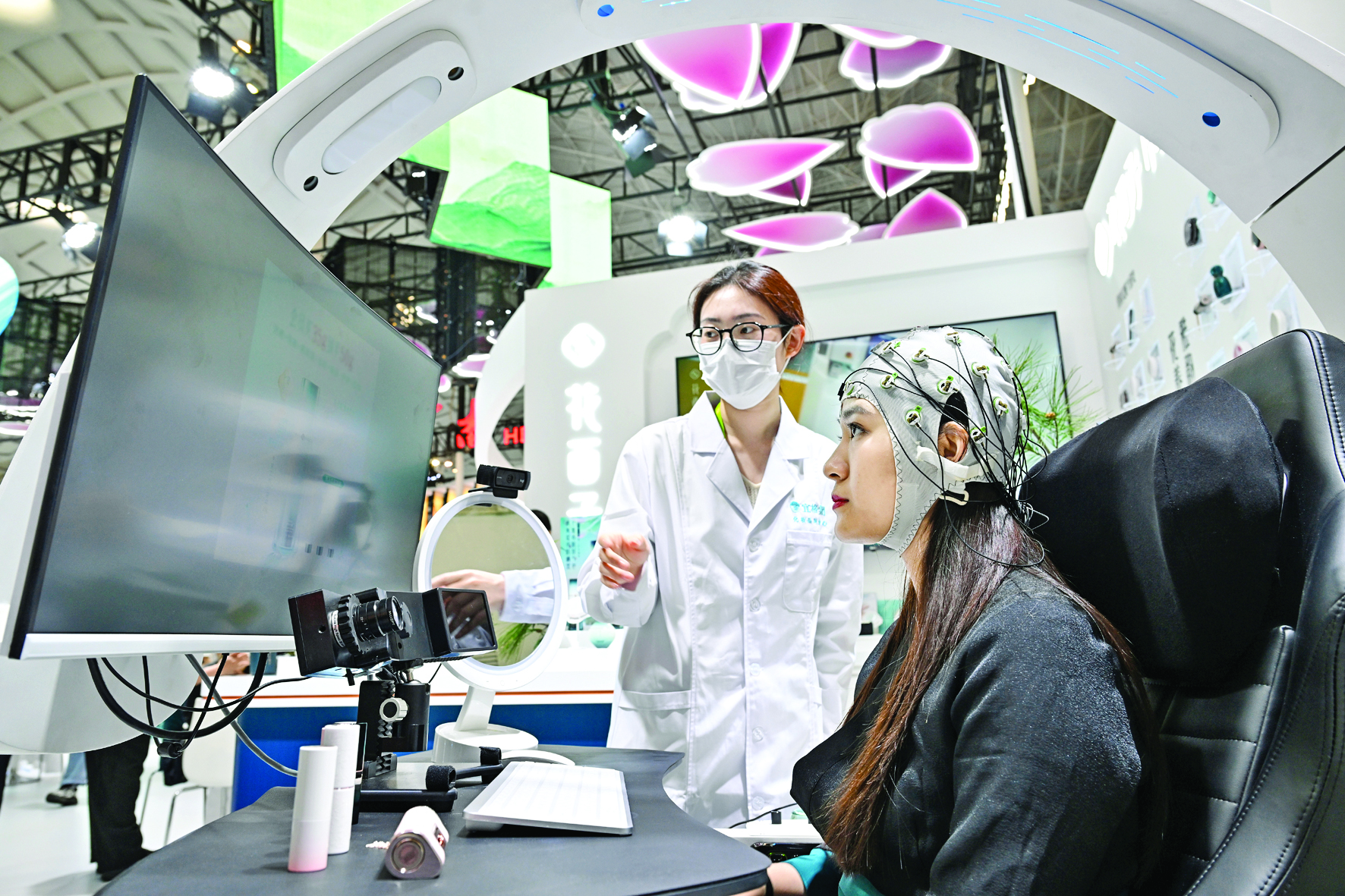 4月13日,展商在消博会现场展示美妆多维全息AI感官行为研究系统,可检测用户对美妆产品满意度。 当日,第五届中国国际消费品博览会在海南举办。本届消博会有全球70多个国家和地区的1700余家企业、4100余个品牌参展。新华社记者 郭程 摄
