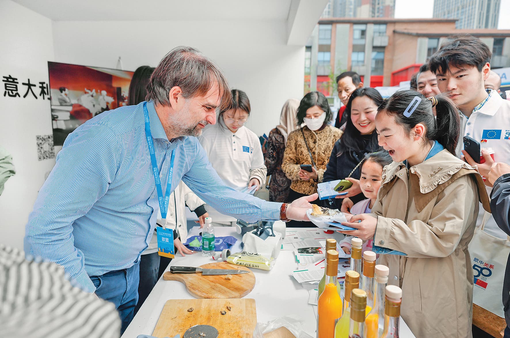 4月12日,参观者在意大利展台品尝比萨。 当日,由欧盟驻华代表团主办的“2025成都·欧洲文化季”暨“欧洲风情街”开幕式在四川省成都市东郊记忆园区举行,现场举行了传统艺术展览、音乐表演、美食体验等活动。 新华社记者 沈伯韩 摄
