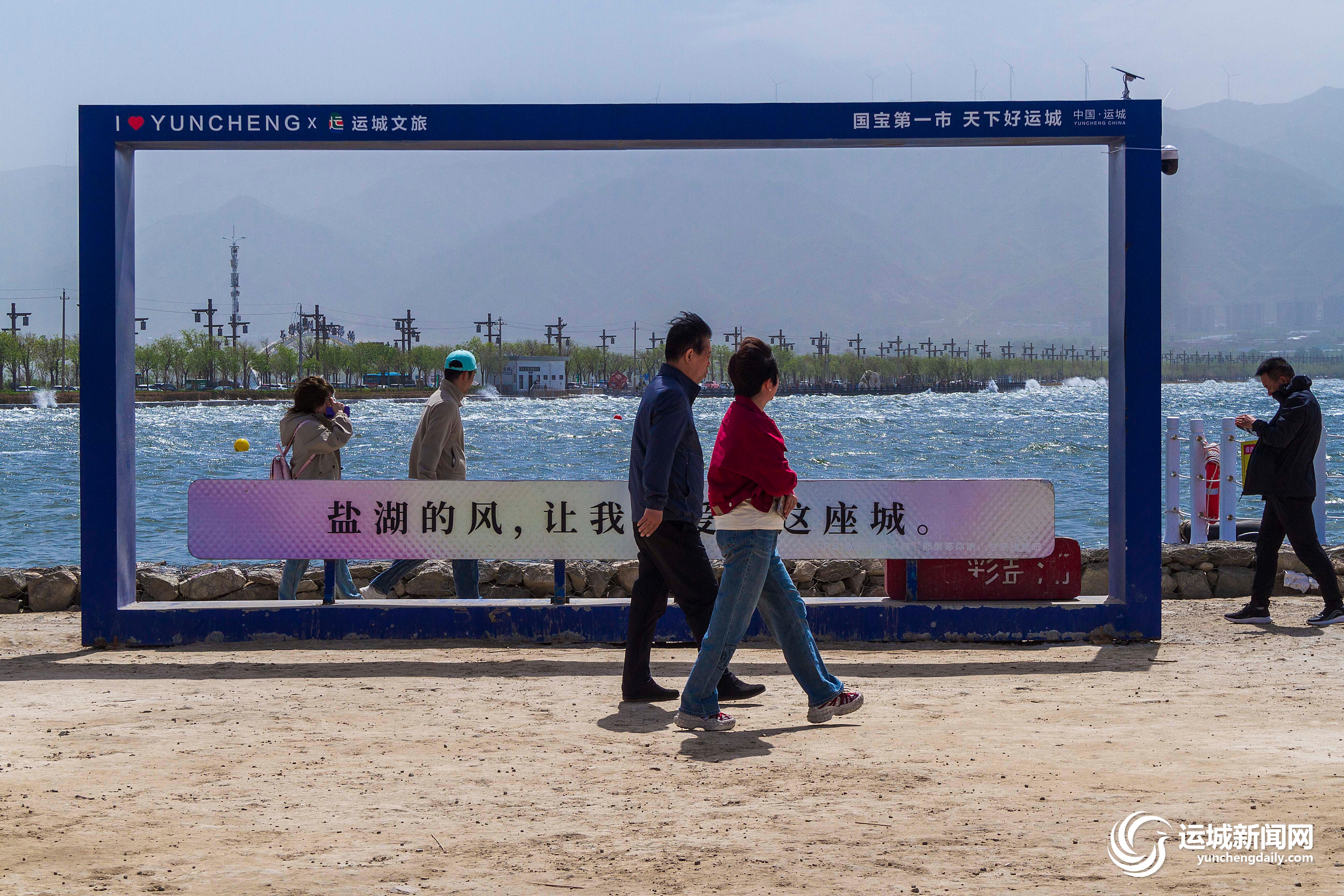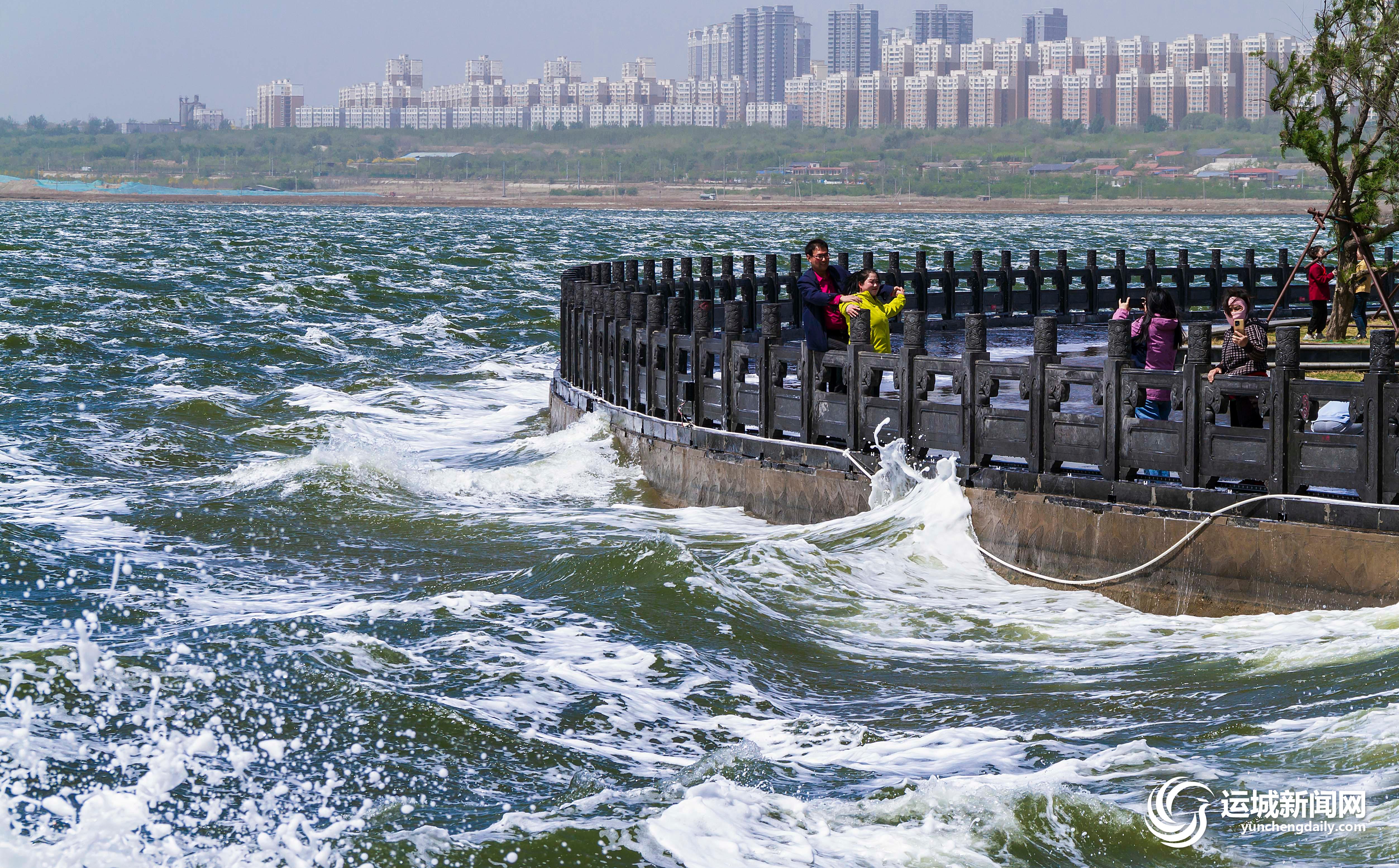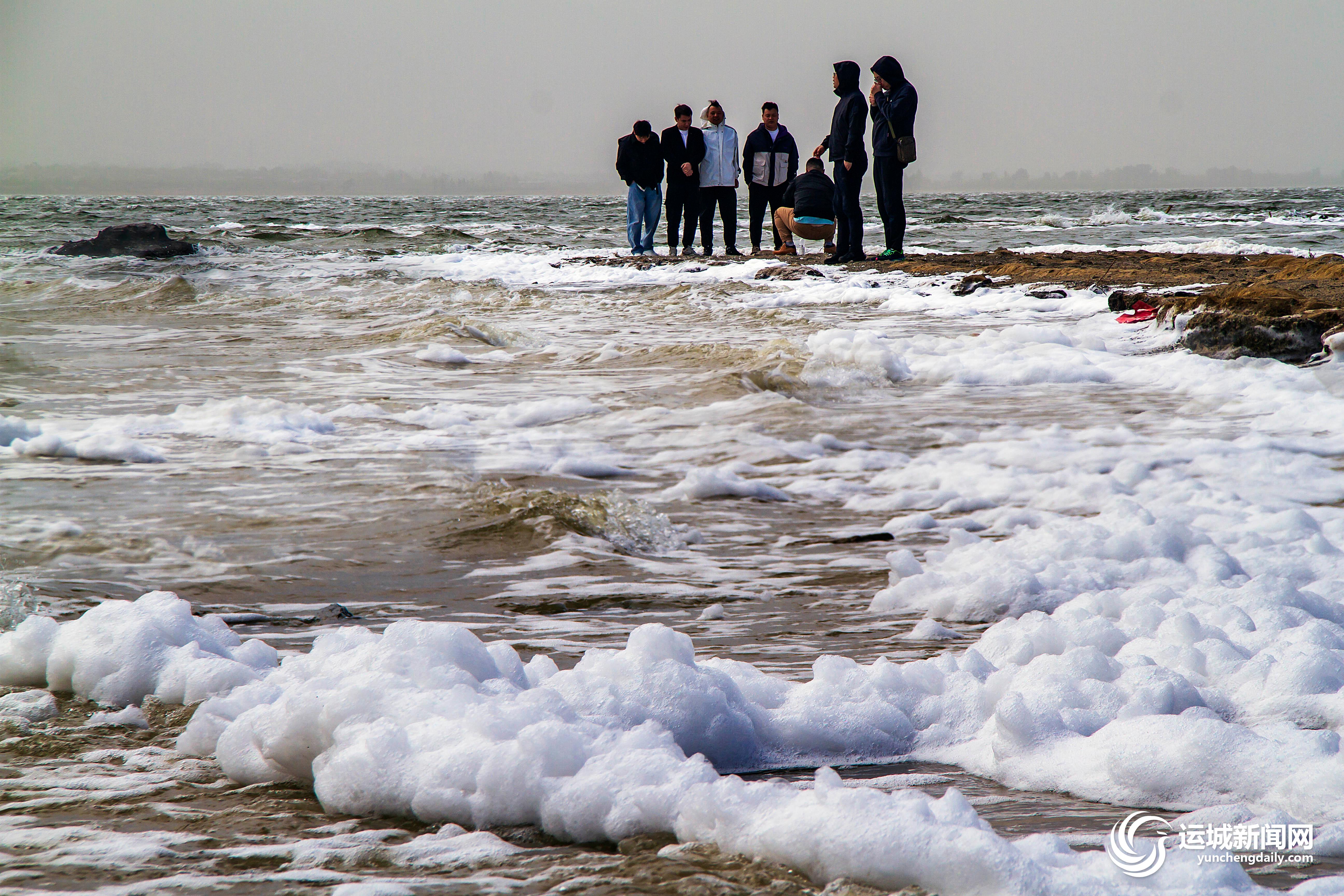 当日,风吹盐湖,浪涛汹涌,这一仿佛大海边的景观,吸引了众多游客前来观赏游玩。