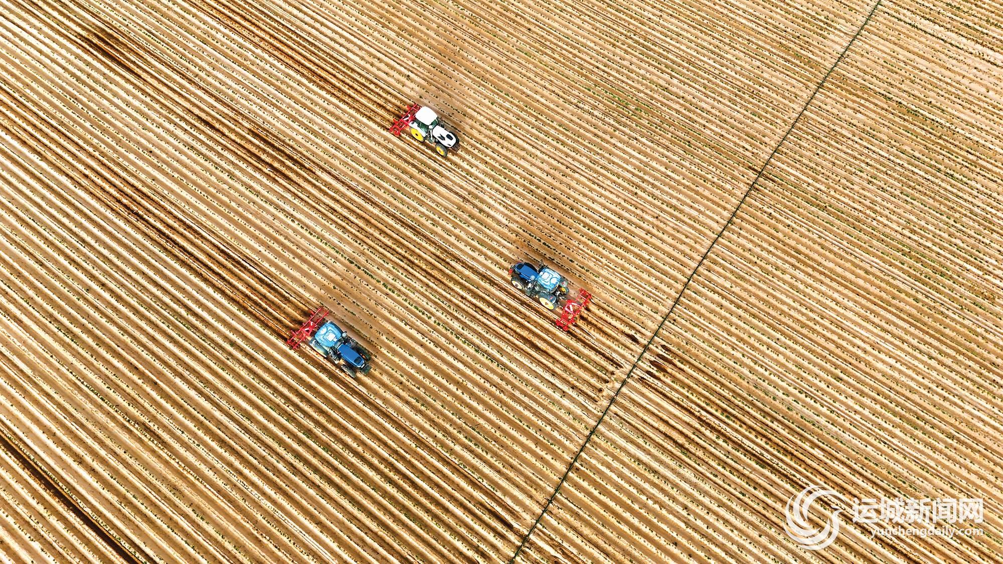 4月13日,3台大型农机在万荣县裴庄黄河滩地进行耙地保墒作业。当地农户利用晴好天气,组织开展耙地保墒作业,为今年粮食丰产丰收打好基础。特约摄影 张怀心 摄