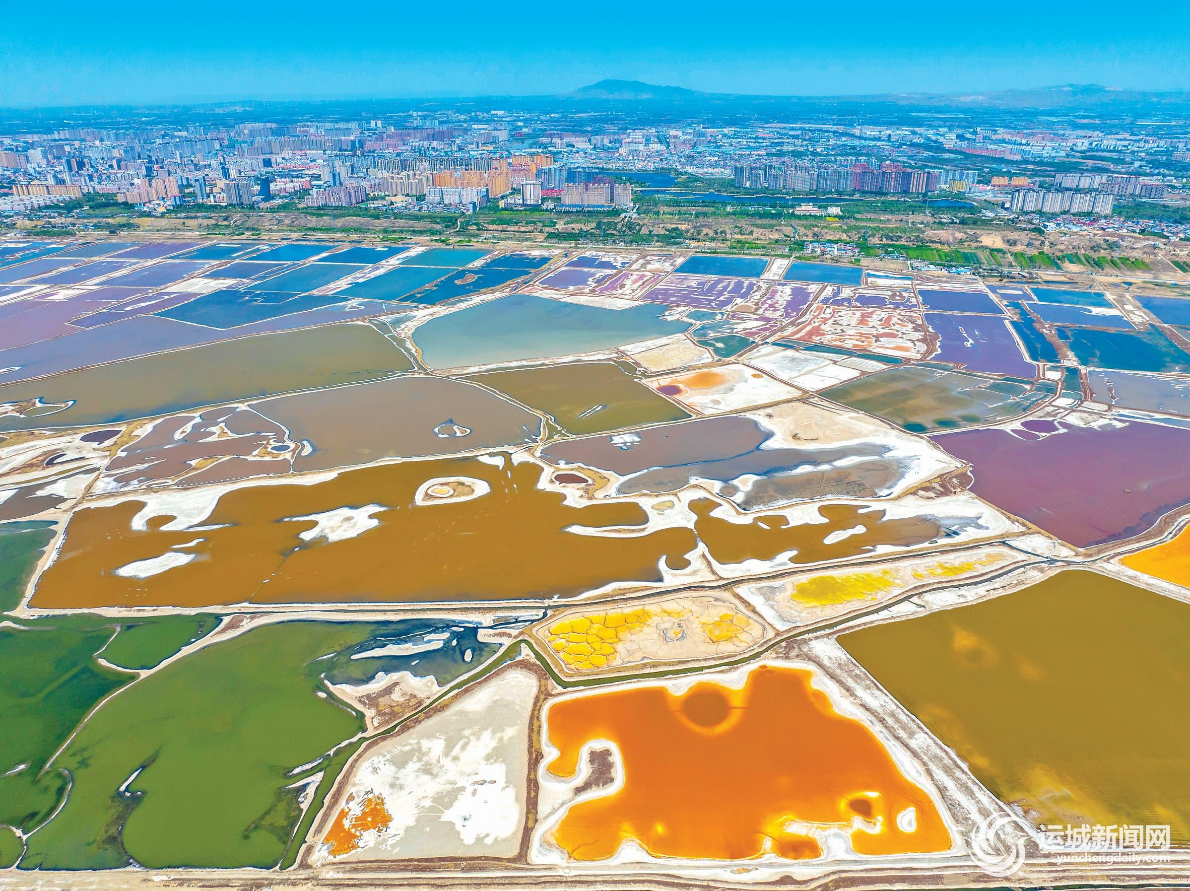 连日来,随着气温回升,运城盐湖迎来一年中最绚烂的时节,湖水在骄阳的映照下幻化出梦幻般的色彩。微风拂过,湖面泛起粼粼波光,不同色带随着水波轻盈舞动,与远处的青山、城市交相辉映,构成一幅“山水城”相融共生的美丽画卷(4月14日摄)。记者 常 奇 摄