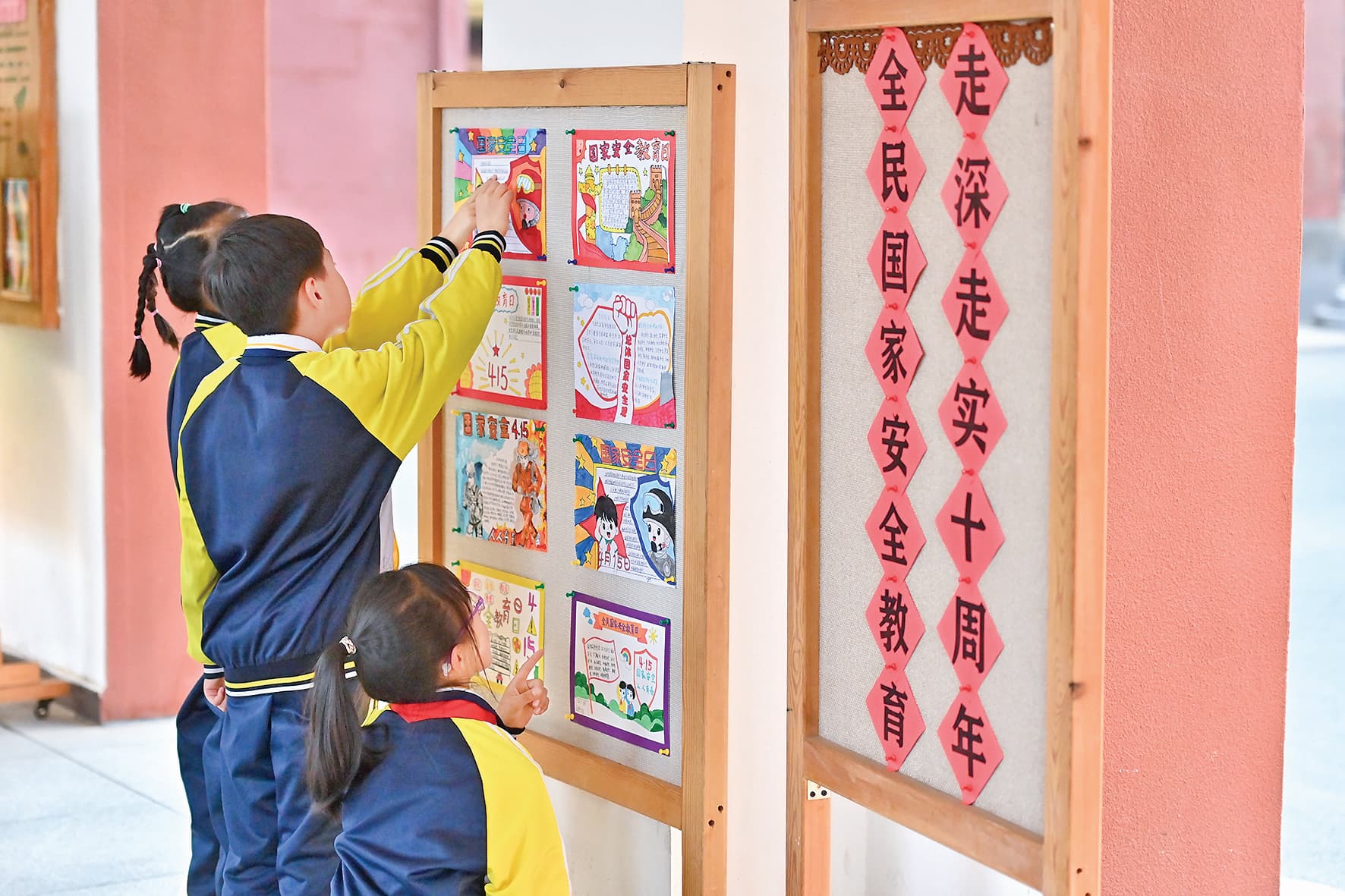 4月15日,在辽宁省海城开发区实验学校,学生在观看全民国家安全教育日主题相关的手抄报。新华社记者 吴青昊 摄