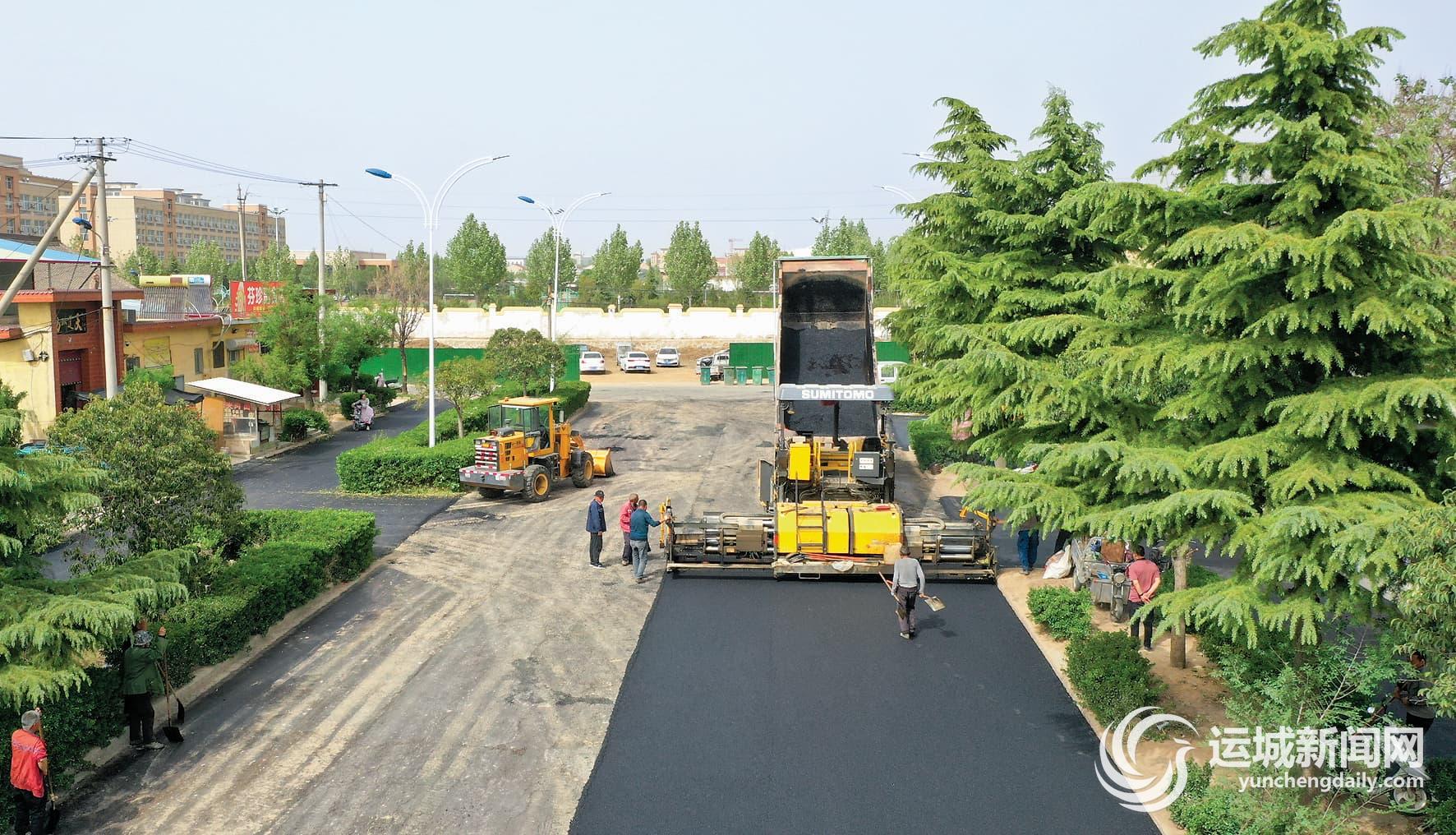 4月16日,施工人员在夏县瑶峰镇益民村铺设沥青路面。