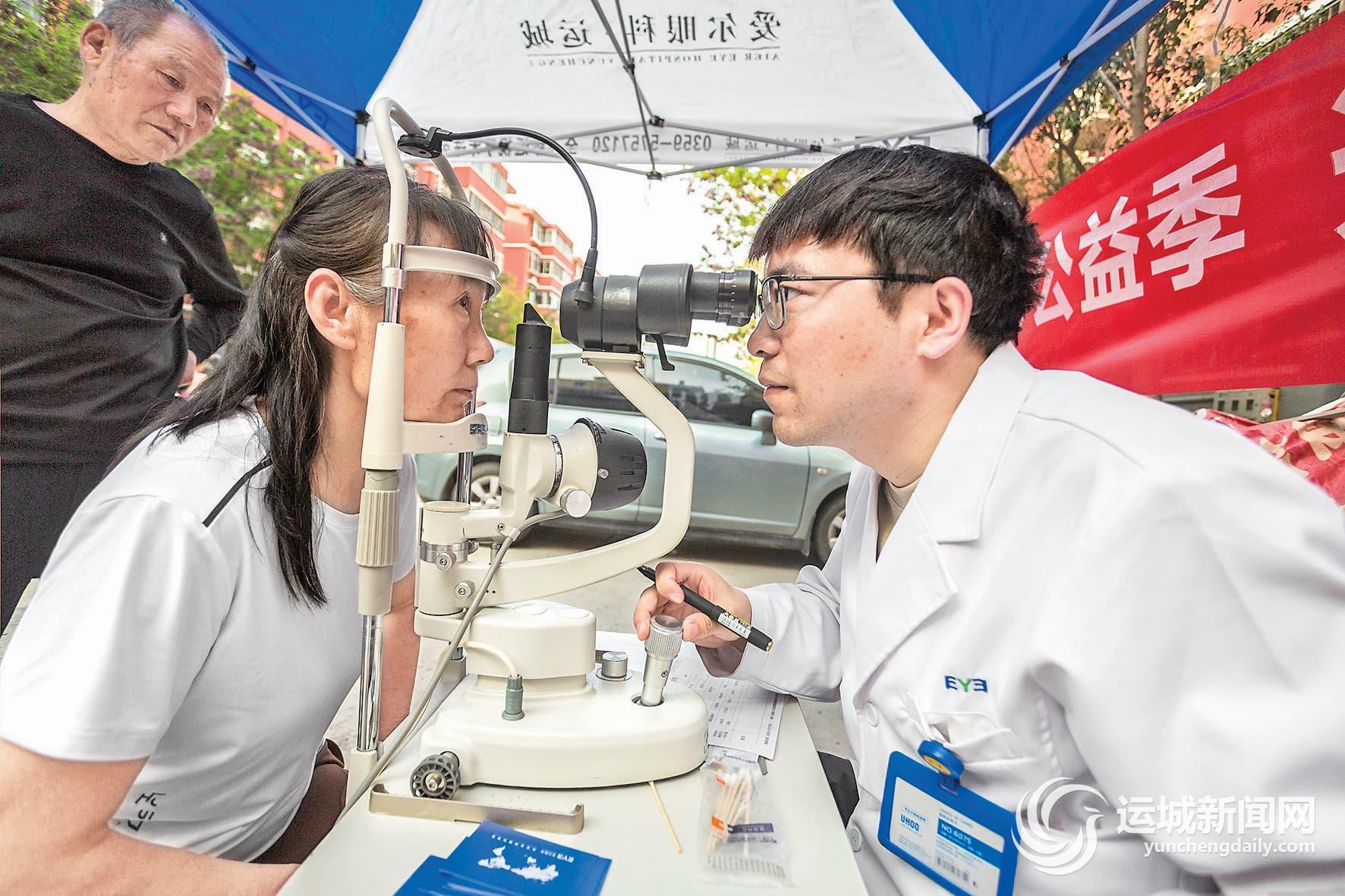 4月17日,盐湖区北城街道石化社区开展惠民服务活动。医疗人员为居民进行眼科义诊。同时,志愿者发放移风易俗、预防电信诈骗等宣传资料,助力居民健康生活。