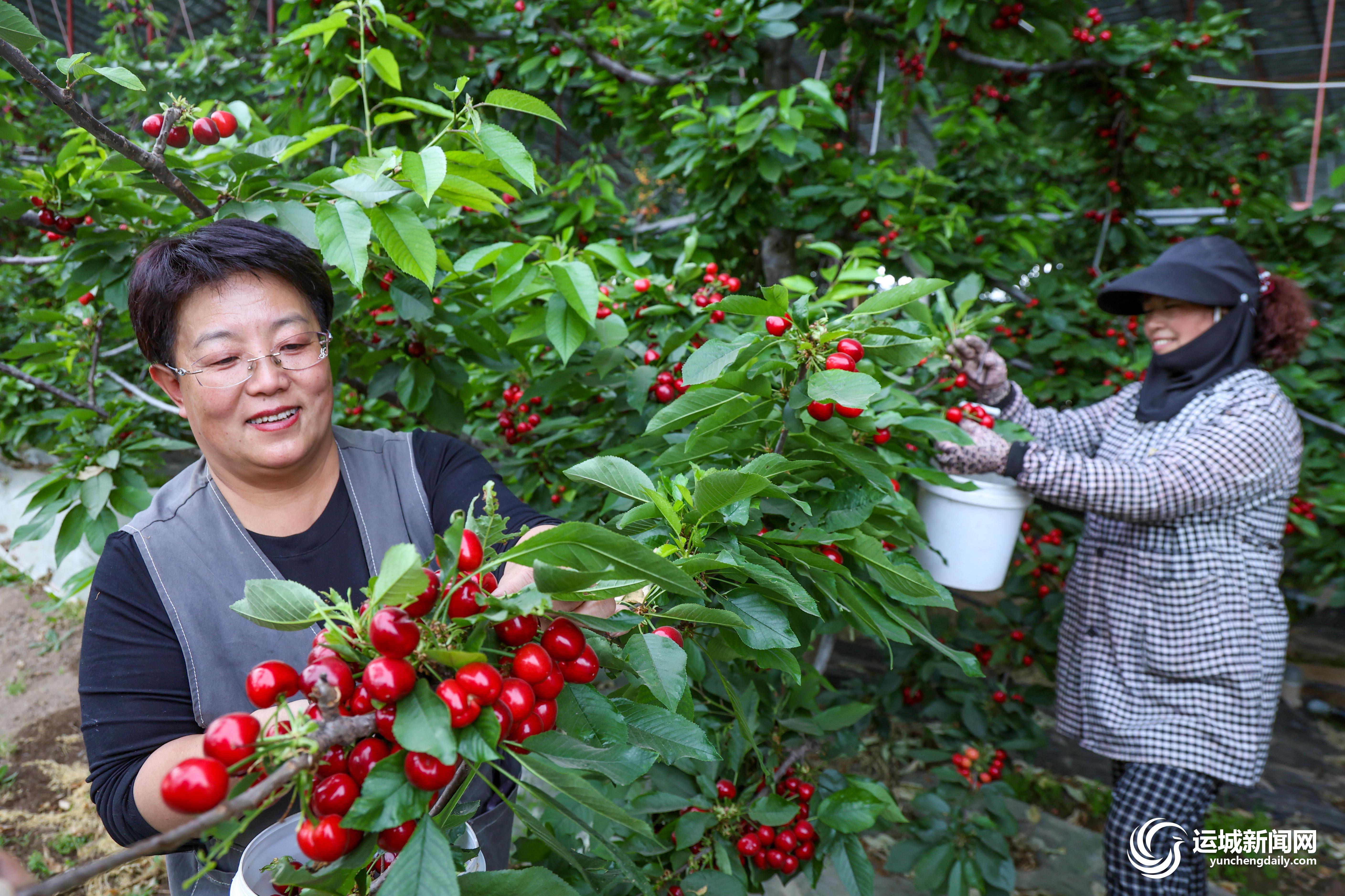 4月17日,绛县史村红绿源家庭农场内,农户忙着采摘樱桃外销。
