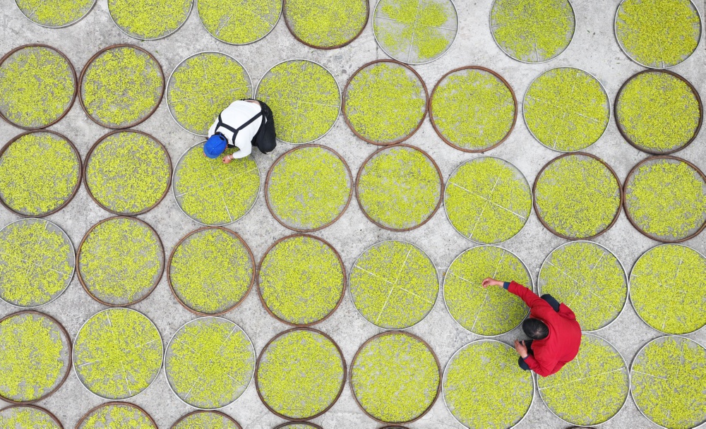 近日,在湖南省永州市双牌县上梧江瑶族乡盘家村云台山生态有机茶园,茶农在摊晒春茶(无人机照片)。