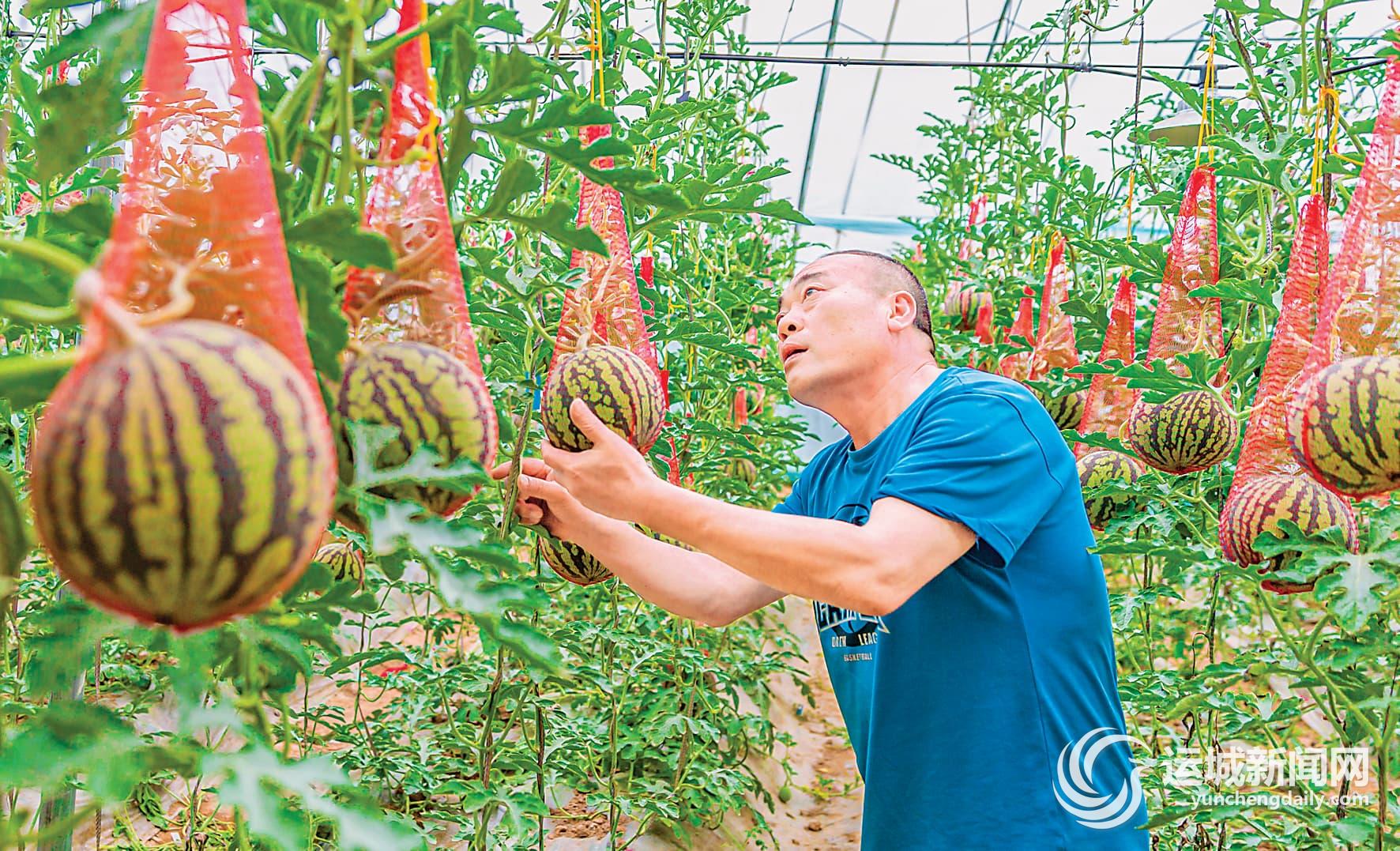 4月21日,夏县裴介镇大吕村西瓜种植大棚内,瓜农正在查看“吊蔓西瓜”长势。