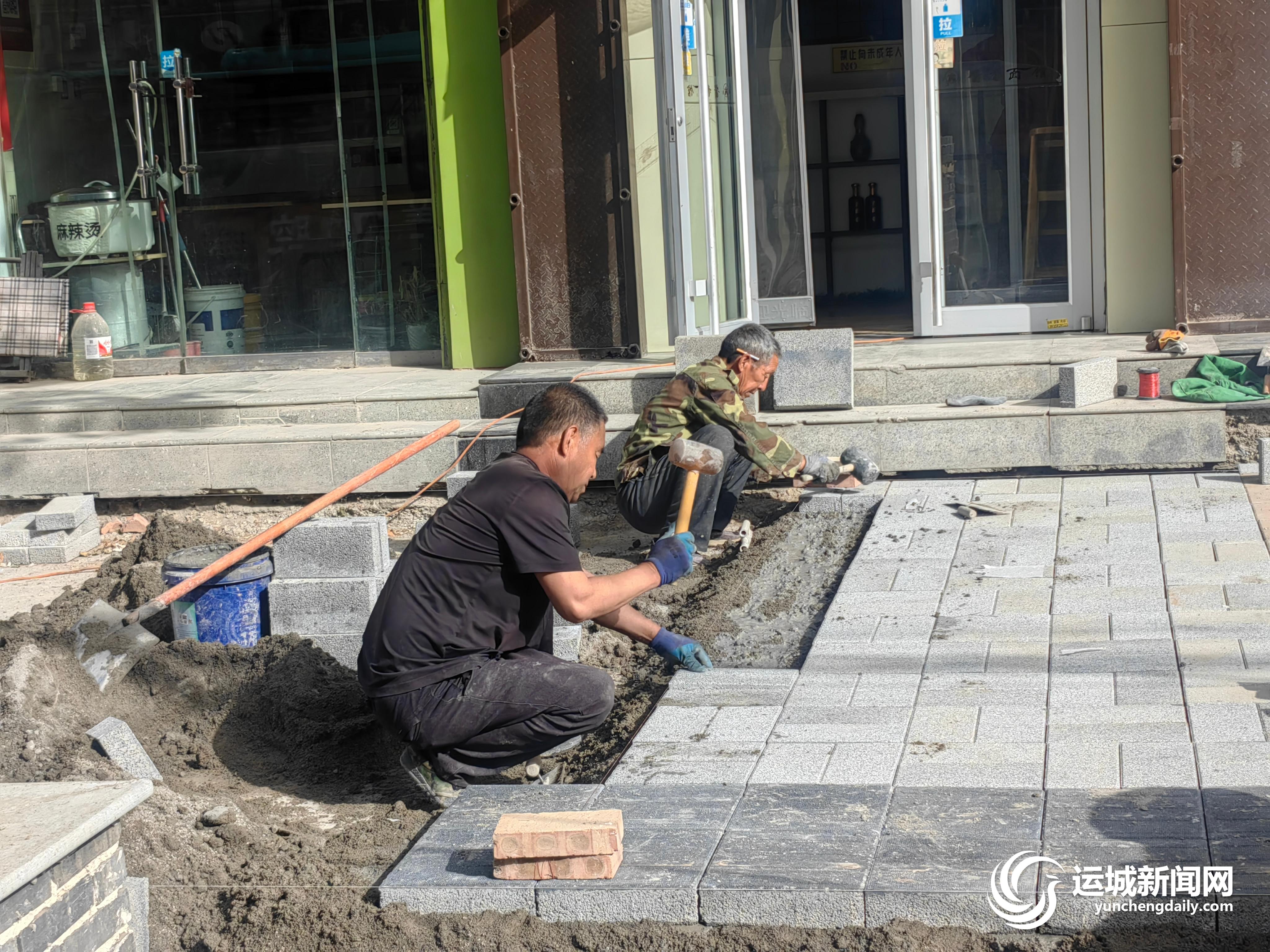 4月23日,在中心城区老东街(人民路至中银路段)人行道上,市政工人在铺设新型透水砖。