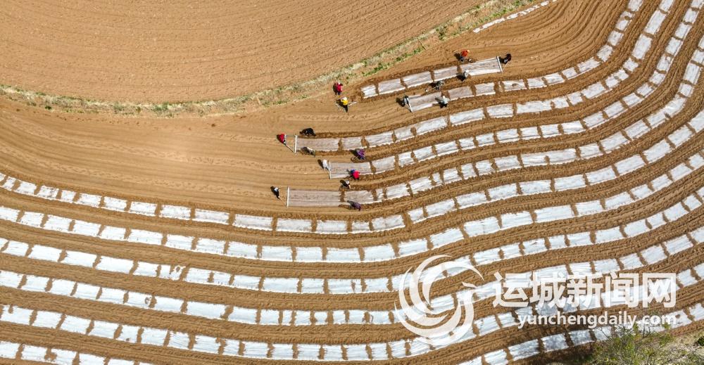 4月22日,在中条山深处的夏县泗交镇温峪村,村民抓住雨后良机,抢墒抢时进行春播地膜覆盖,田间地头一派繁忙景象。