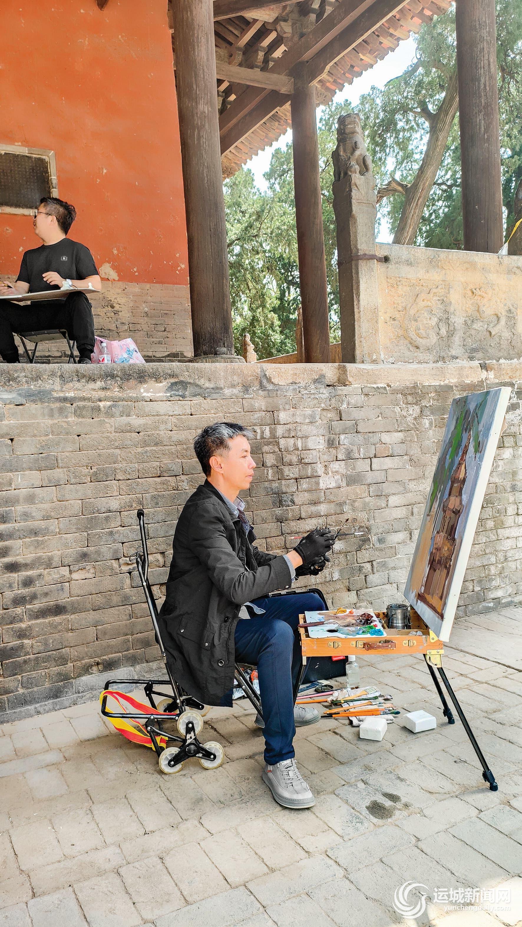画家们分散于庙内各处,或仰观飞檐、或俯察石刻、或静坐写生。