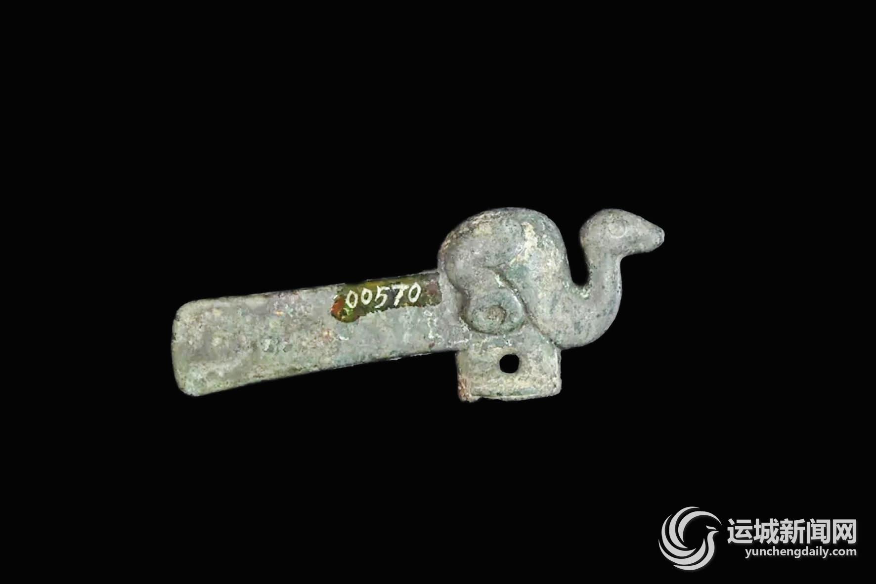 这件鸟形铜车饰为车马插件,通常安装在战车或马车的车辕、车轴、车舆等部位,是1987年从盐湖区南相村出土的,通长12.5厘米、宽4.7厘米。其以鸟为造型,形态生动、线条流畅,尤其眼睛、喙部等细节刻画得栩栩如生。鸟儿前视远方,仿佛已做好准备随时展翅高飞,引领着车马“飞奔”向前,又仿佛随时待命,守护着车马的主人。鸟儿整体姿态轻盈但不失动感,展现了战国时期工匠高超的青铜器铸造技艺,也体现了当时独特的审美观念。