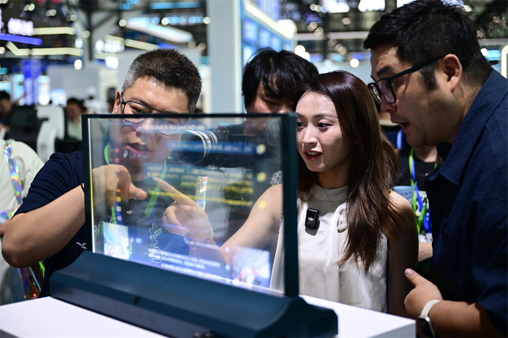 4月26日,观众在第三届中国(安徽)科技创新成果转化交易会上体验一款多语种AI透明屏。