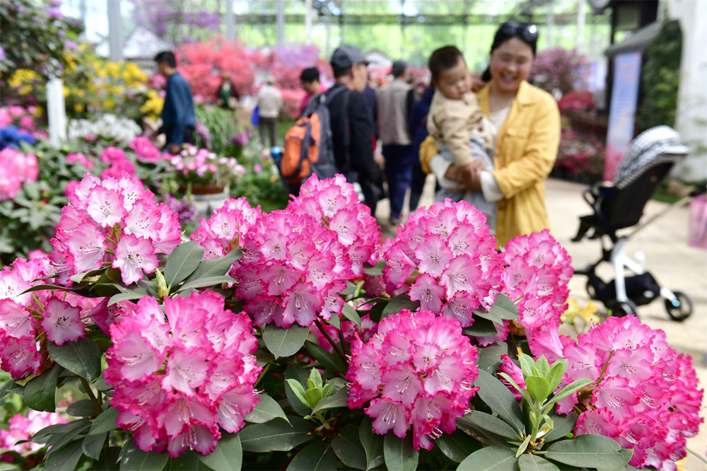 4月28日,在中国杜鹃花博览园,游客在游园赏花。
