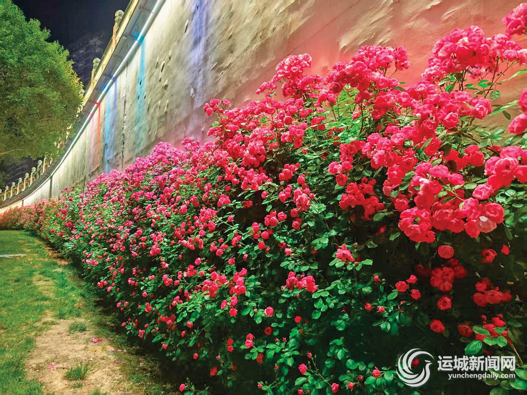在公园北门入口处、体育场地旁、飞雁桥下的墙角等处,还有十几处月季花架成的花墙。放眼望去,那一簇簇月季红的似火,热情奔放,像是燃烧的火焰,点燃了人们对生活的激情;粉的像霞,娇嫩柔美,宛如少女害羞的脸颊,十分惹人怜爱;白的如雪,纯净无瑕,散发着淡雅的气息,给人带来心灵的宁静……市民和游客纷纷驻足,拿出手机、相机,记录下这如梦似幻的美景。特别是一到傍晚,公园里和飞雁桥两侧的灯光依次亮起,将月季花映照得更加明艳动人,路过的市民总会停下脚步,忍不住多看几眼。