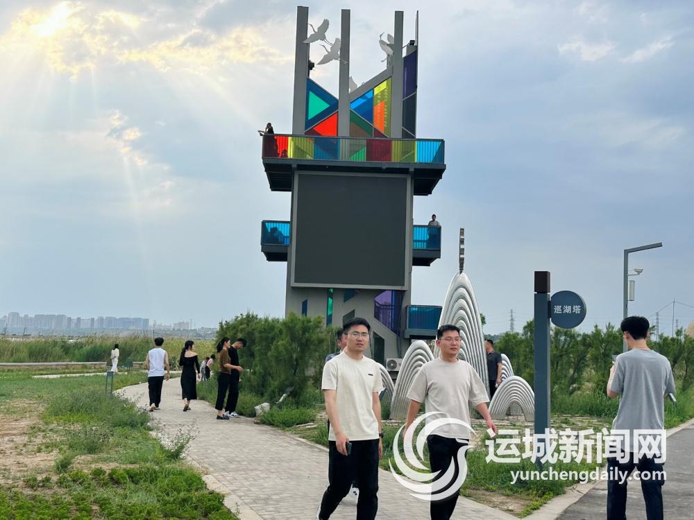 色彩斑斓的观景塔引人注目,不少游客在上面俯瞰园区美景。现代感十足的艺术装置与自然景观在此交融,鸭子池碧波荡漾,芦苇随风摇曳。游客们在运动休闲的同时,沉浸式领略河东成语的文化魅力,纷纷为丰富美好的体验点赞。