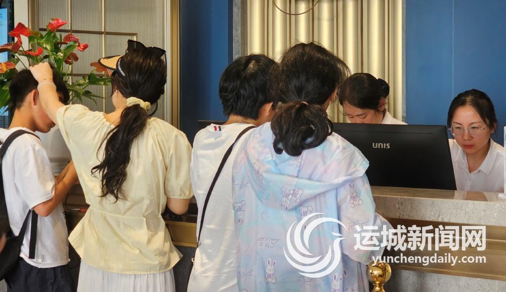 李先生一家从西安自驾,在运旅游的第一站是永济市,住宿地点选在了面山临湖的听涛阁。当天,大厅内的游客人来人往,或选购文创产品,或办理入住,大家在工作人员和志愿者的引导下有序活动。