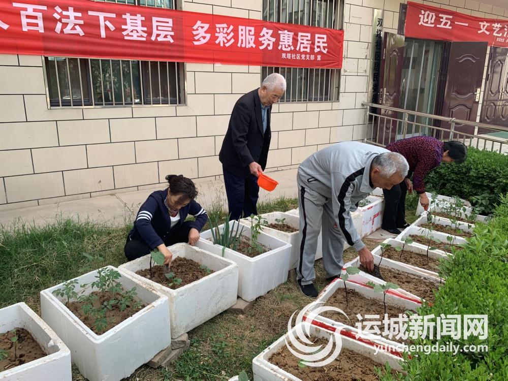 近日,在临猗县双塔社区党群服务中心旁边的空地上,居民王金虎、周恩芳、廉改清等人一有空就来“摆弄”菜苗,有的给菜苗浇水,有的松土,几个人边干活边聊天。