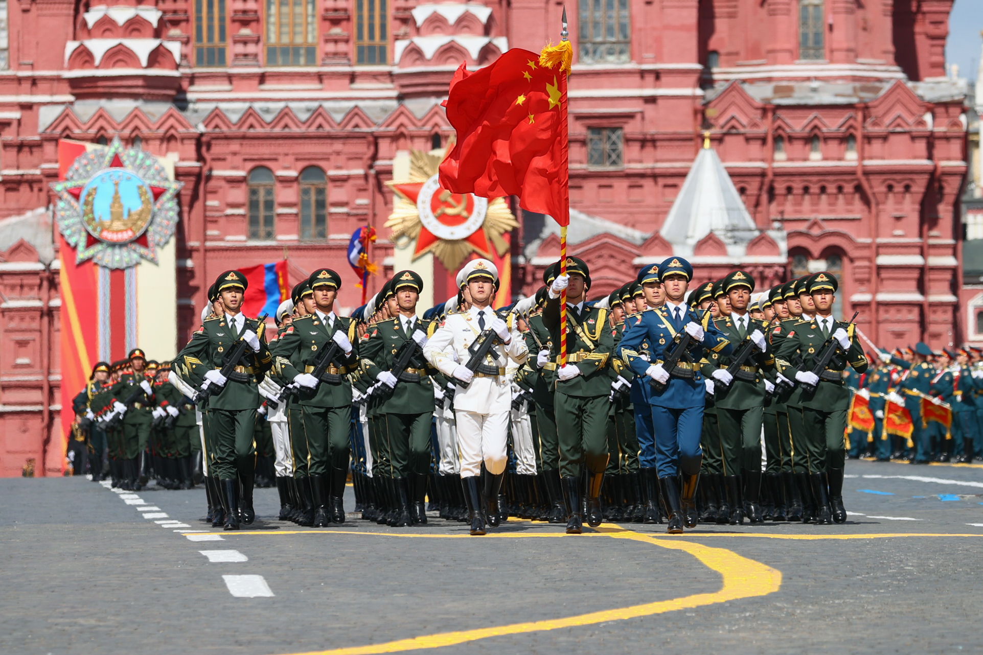 5月9日,在俄罗斯首都莫斯科,中国人民解放军三军仪仗队方队参加纪念苏联伟大卫国战争胜利80周年阅兵式。