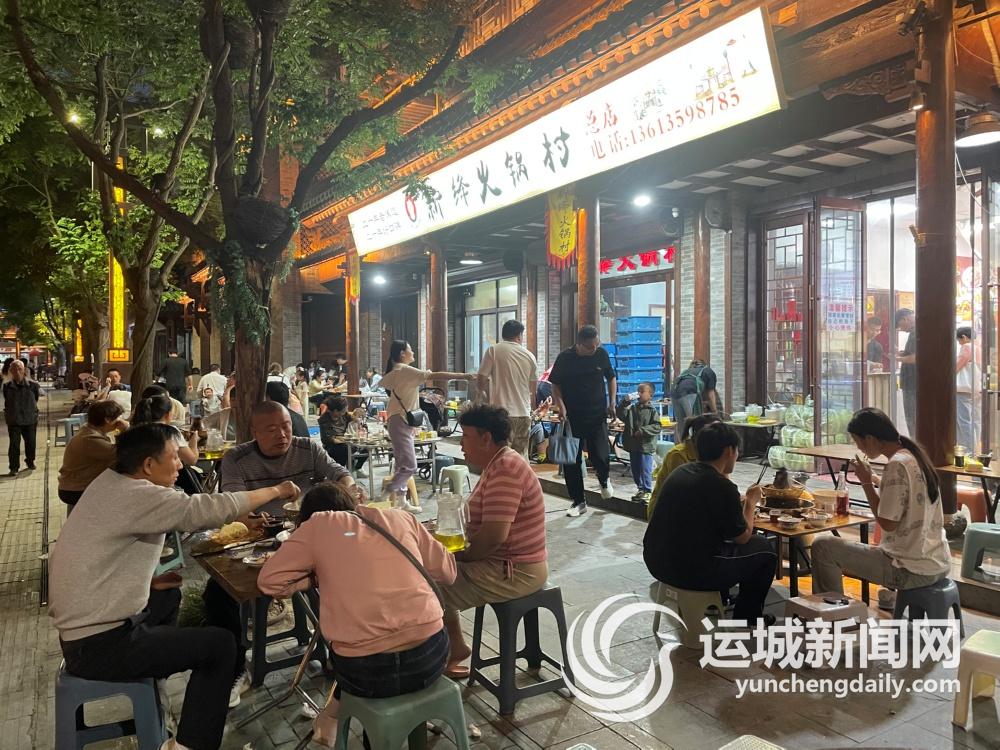 今年“五一”假期,大量游客涌入盬街。在这里,鲜肉馄饨、新绛铜火锅、盐焗鸡等各种美食琳琅满目。一路走去,羊肉在炭火上烤得嗞嗞作响;地摊牛排搭配上秘制酱汁令人垂涎不已;馍夹菜口感丰富,让人回味无穷;串串香、饼子夹串等各种特色小吃也都各有千秋。游客有的围坐在一起吃着热气腾腾的火锅,有的手拿小吃三五成群穿梭其中,有的则带着孩子在石雕前“打卡”拍照,尽享夜晚的惬意时光。