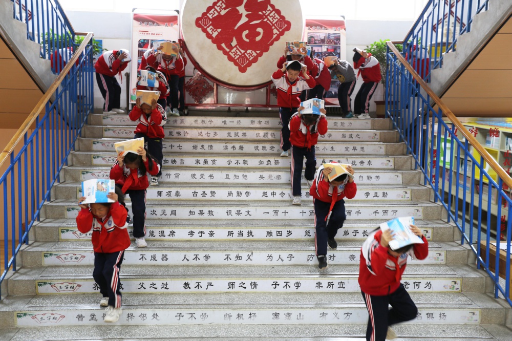5月12日,甘肃省定西市安定区福台小学的学生在进行防震减灾应急疏散演练。