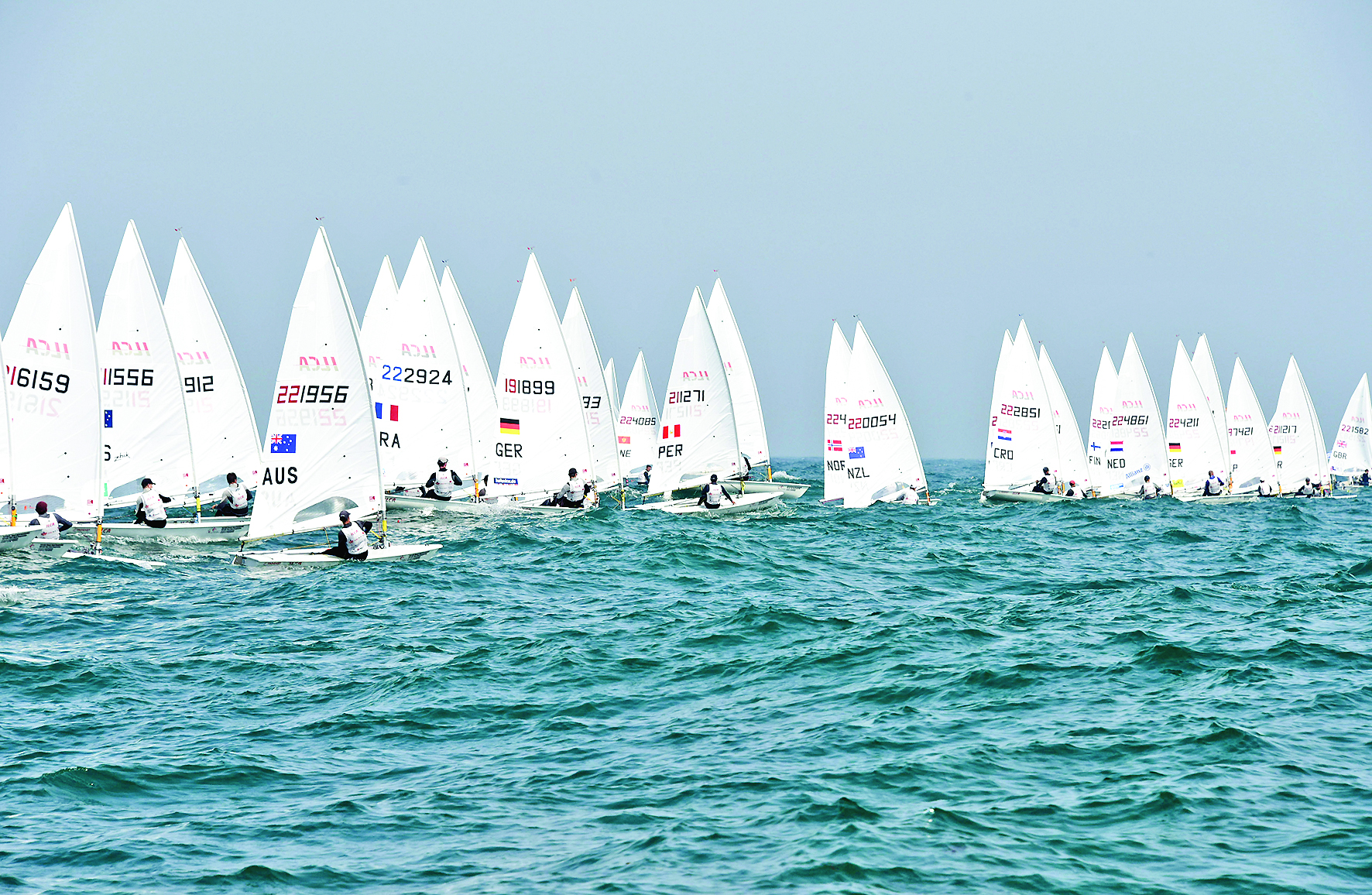 5月12日,参赛选手在男子ILCA7级首轮比赛中。当日,2025男子ILCA7级与女子ILCA6级世界帆船锦标赛首轮比赛在山东青岛市进行。新华社记者 李紫恒 摄