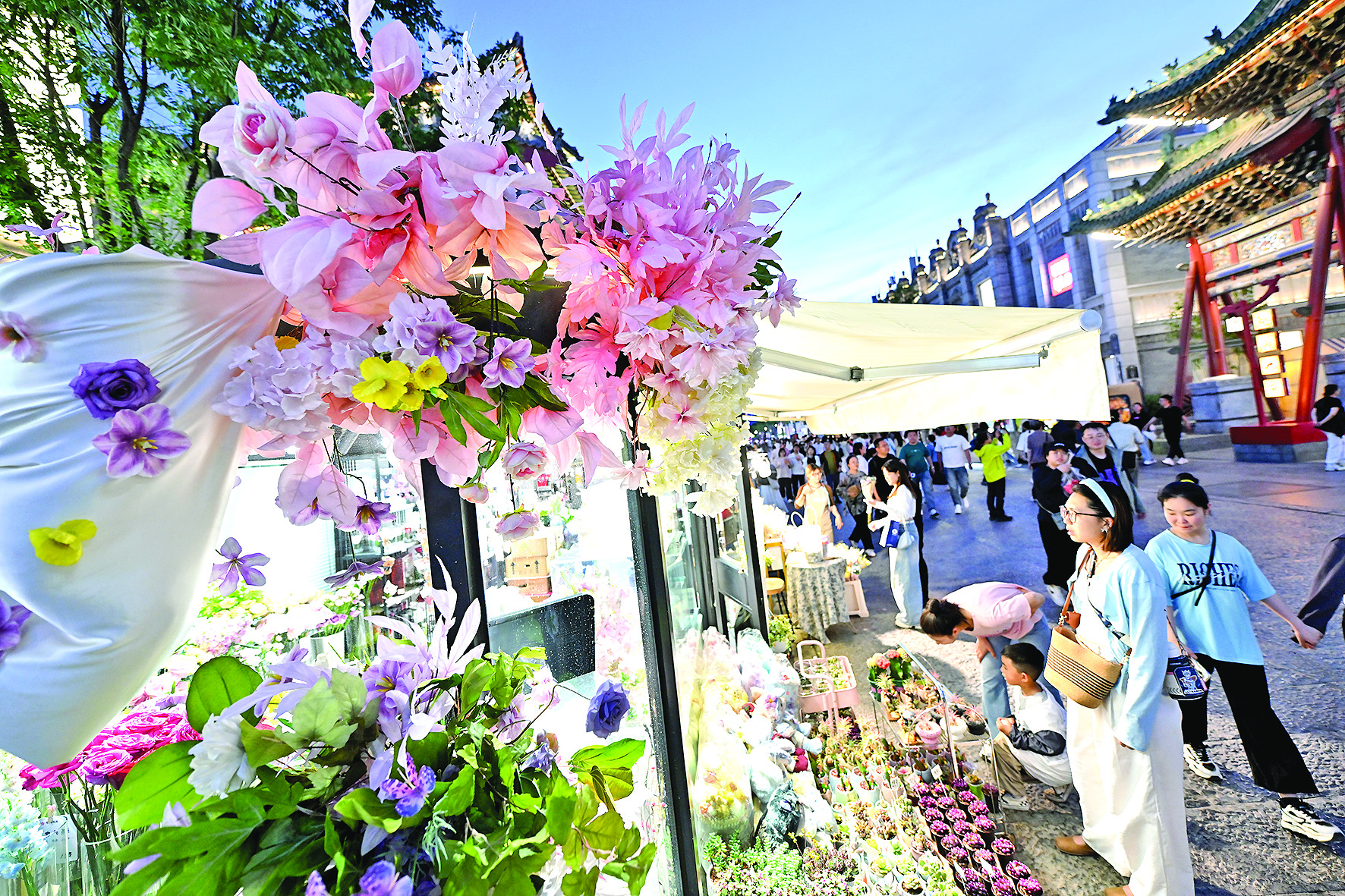 ▲5月14日,游客在太原市钟楼街选购鲜花。 夜幕降临,太原市钟楼街、食品街等特色街区及汾河两岸流光溢彩、游人如织。近年来,太原市不断丰富夜经济消费业态,开展多种夜间活动,打造集美食、观光、购物等于一体的夜经济消费圈,丰富市民游客夜生活。 新华社记者