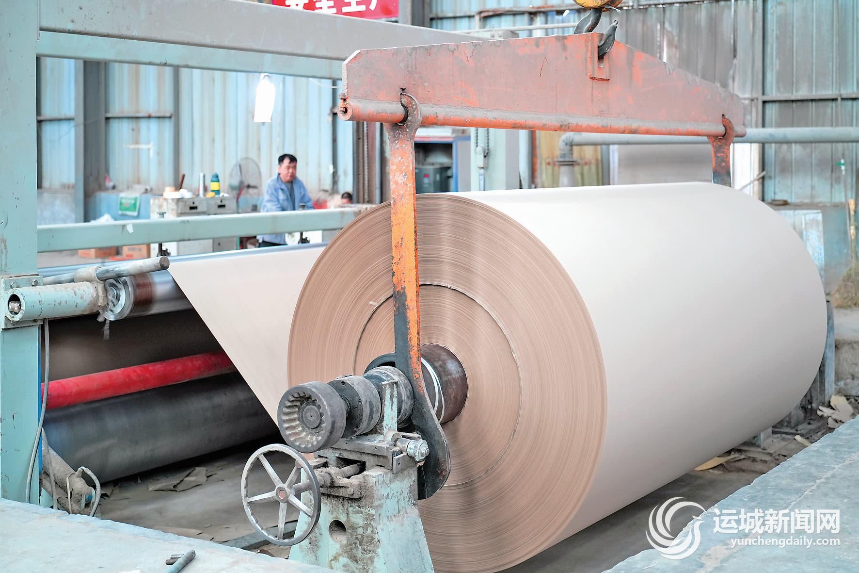 稷山县鹏腾工贸有限公司内,机器将刚生产出来的瓦楞纸卷成规格为1吨的纸卷。记者 陈方斌 摄