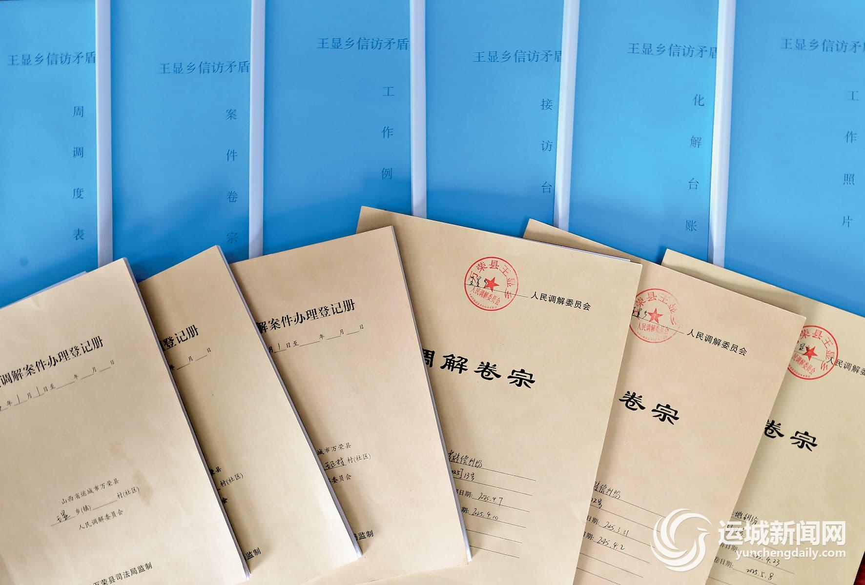 王显乡摆放整齐的工作台账和调解卷宗。记者 金玉敏 摄