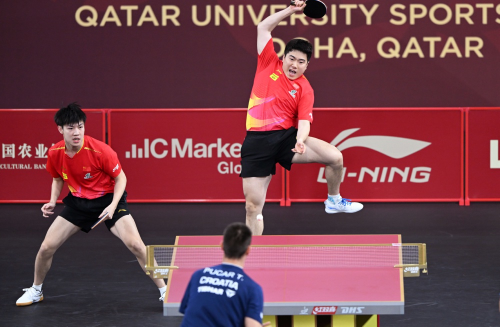当日,在卡塔尔多哈举行的2025世界乒乓球锦标赛男子双打第二轮比赛中,中国组合梁靖崑/黄友政3比1战胜约奇克(斯洛文尼亚)/普卡(克罗地亚),晋级16强。 新华社记者