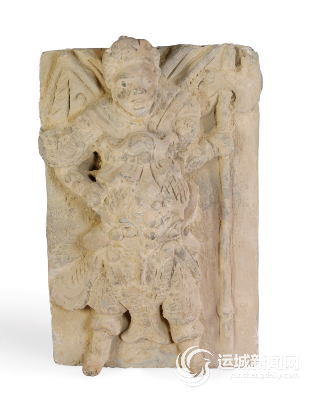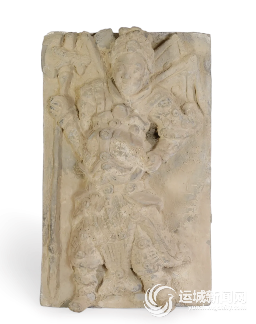 作为地下世界的守护者,这对来自金代的门神神荼、郁垒砖雕向我们传递着千年前的文化信息。在这两块长方形砖雕上,两位神将头戴盔、身披甲、护背旗,手执兵器,一左一右,相对而立。面部线条看起来刚劲有力,眼神锐利而深邃,仿佛能洞察世间一切魑魅魍魉;身材则魁梧壮硕,肌肉线条在衣物下若隐若现,展现出强大的力量感。