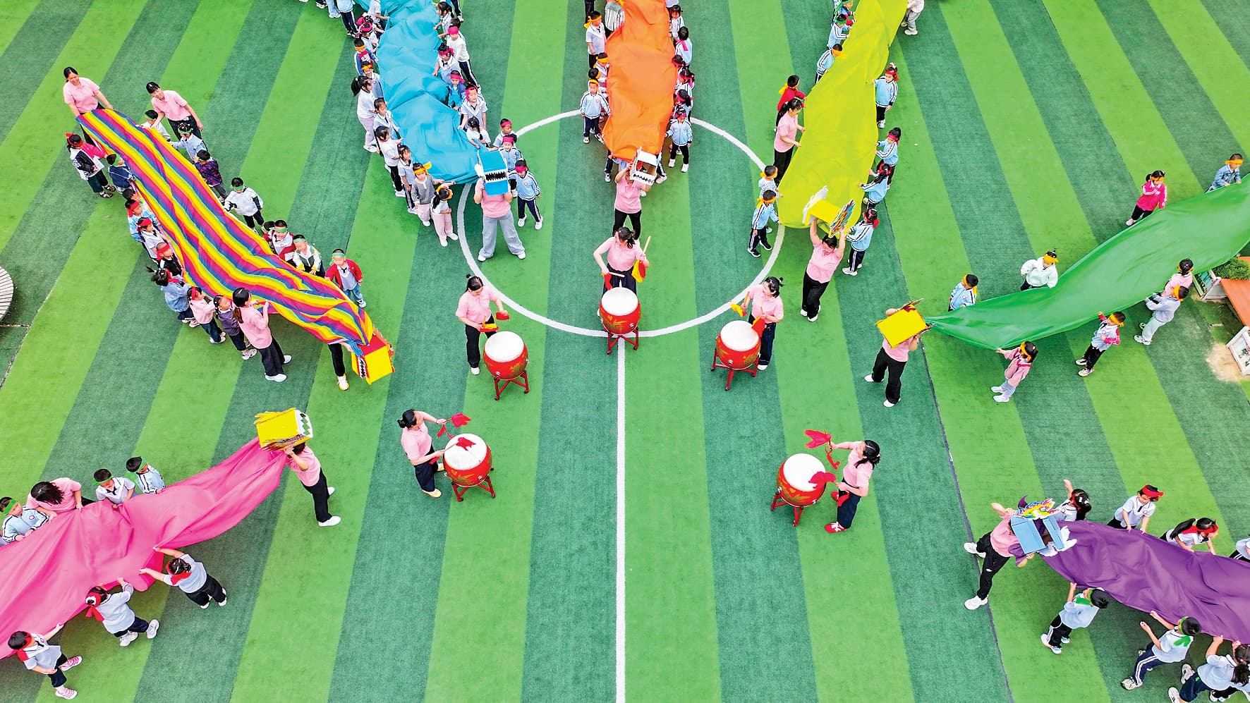 5月23日,在山东省东营市广饶县李鹊镇中心幼儿园,小朋友在进行龙舟赛游戏(无人机照片)。 新华社发(刘云杰 摄)