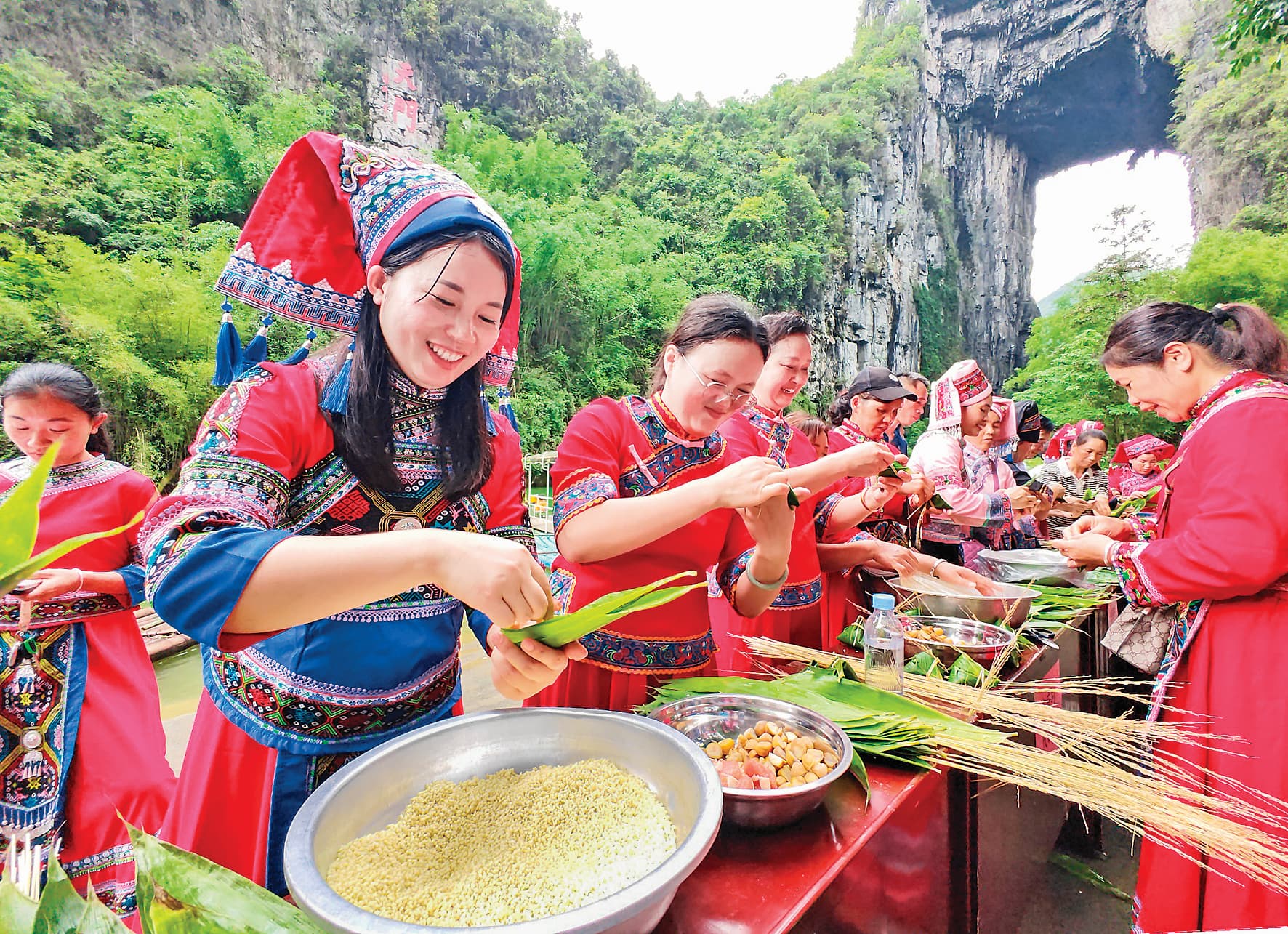 5月23日,在广西罗城仫佬族自治县怀群镇天门山景区,游客与村民在参加包粽子比赛。 新华社发(蒙增师 摄)