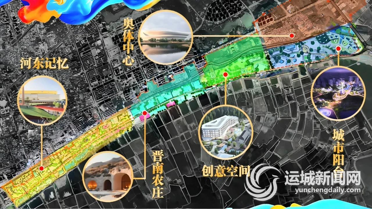 概括来讲,“盐梦长廊”这一规划项目,占地约10035亩,西起解放南路,东至826县道,东西长约10公里,南北宽0.2公里至1.6公里,总占地面积约6.69平方公里,划分为五大主题区域——“奥体中心”“河东记忆”“城市阳台”“晋南农庄”“创意空间”。该长廊是集文化、体育、休闲、旅游、创意等多种功能于一体的综合性区域。