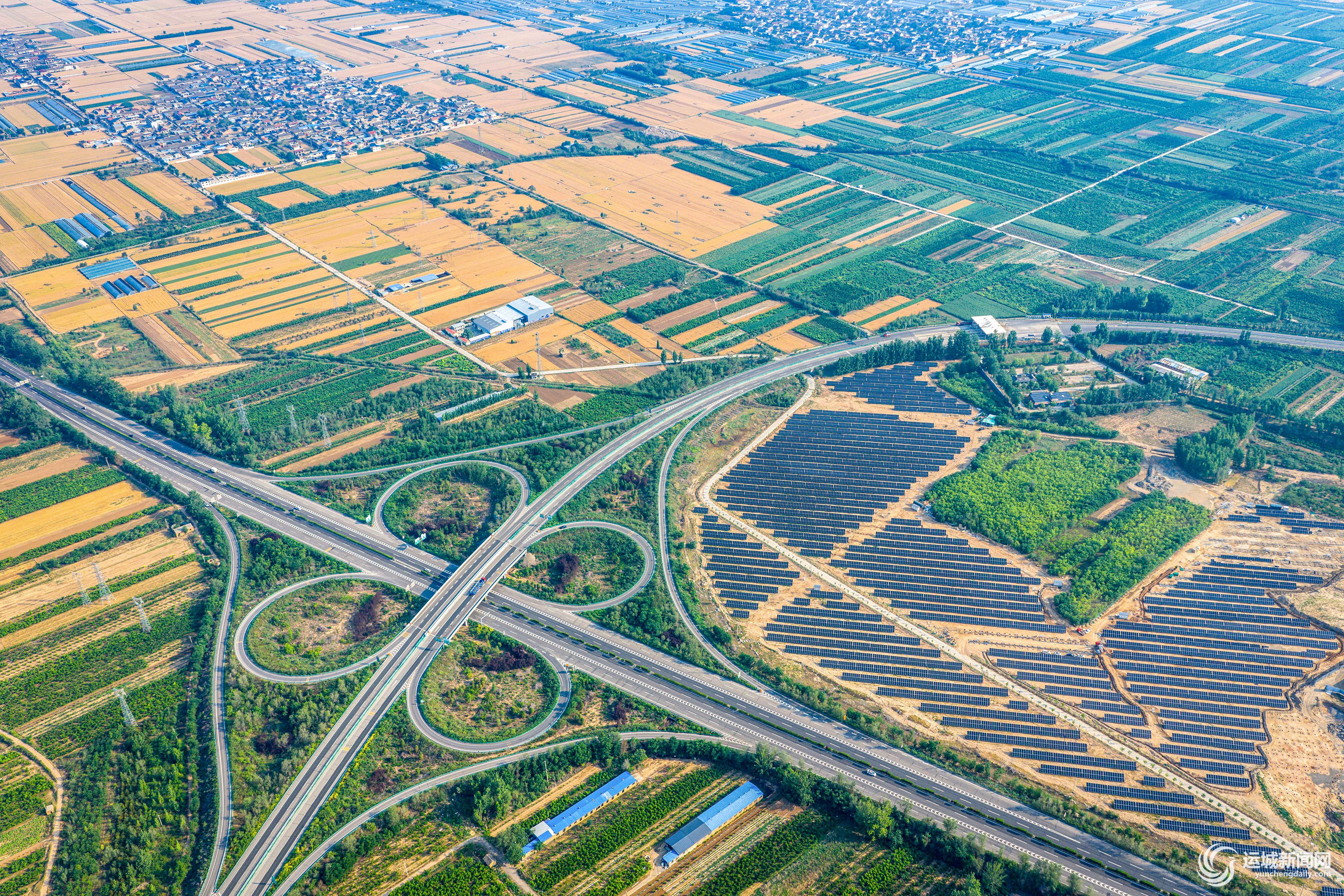 当前,山西交控新能源发展有限公司在全市范围内高速公路沿线的互通枢纽、道路边坡、隧道出入口等处建设光伏电站,进一步推动绿色交通发展。图为建设中的光伏发电站项目与东郭高速互通枢纽、金色的麦田互为映衬,构成一幅绿色发展新画卷(5月26日摄)。 记者 闫 鑫 摄