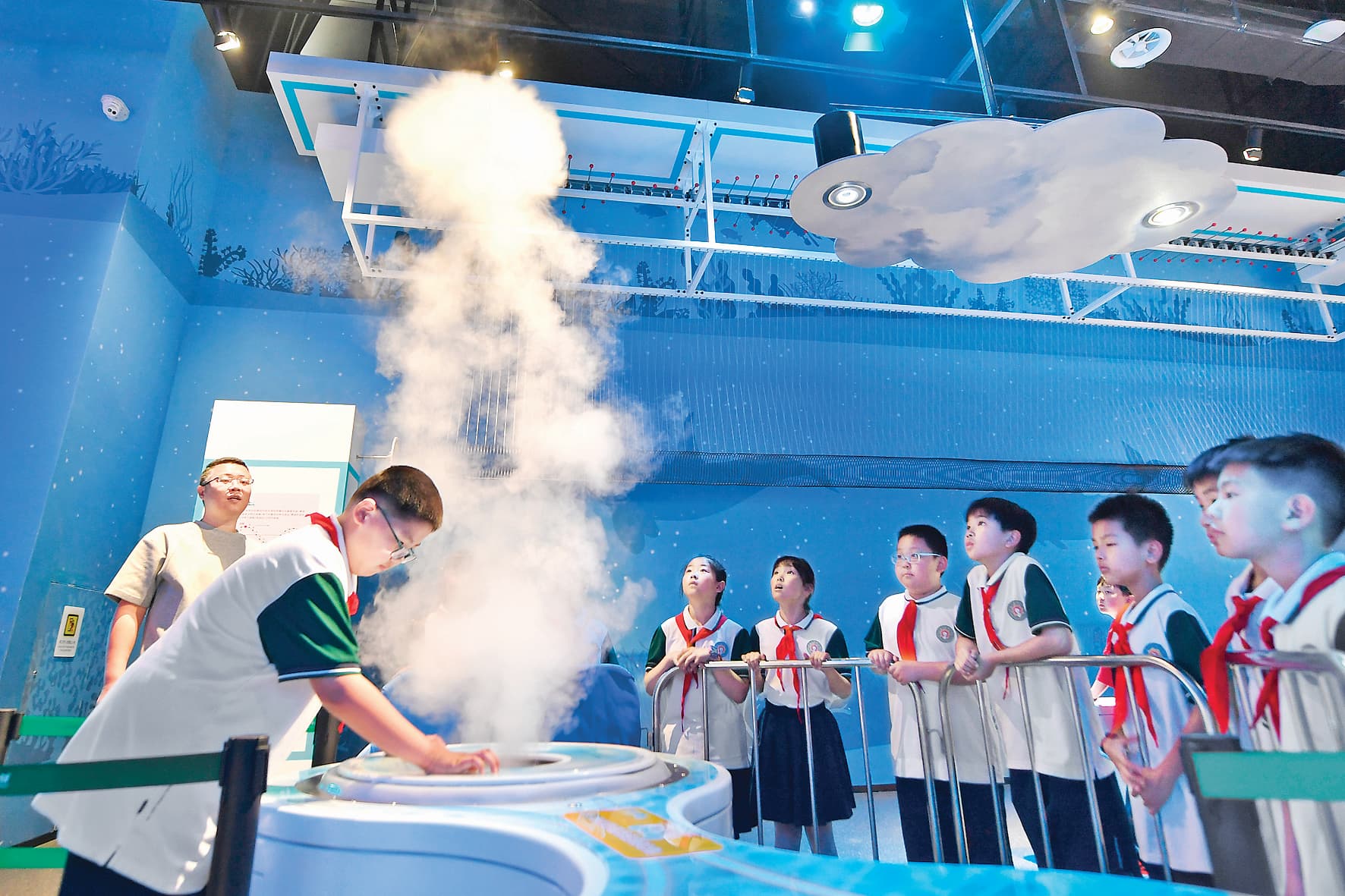 5月25日,山东省青岛市市北区开平路小学学生在青岛科技馆体验“空气炮”装置。