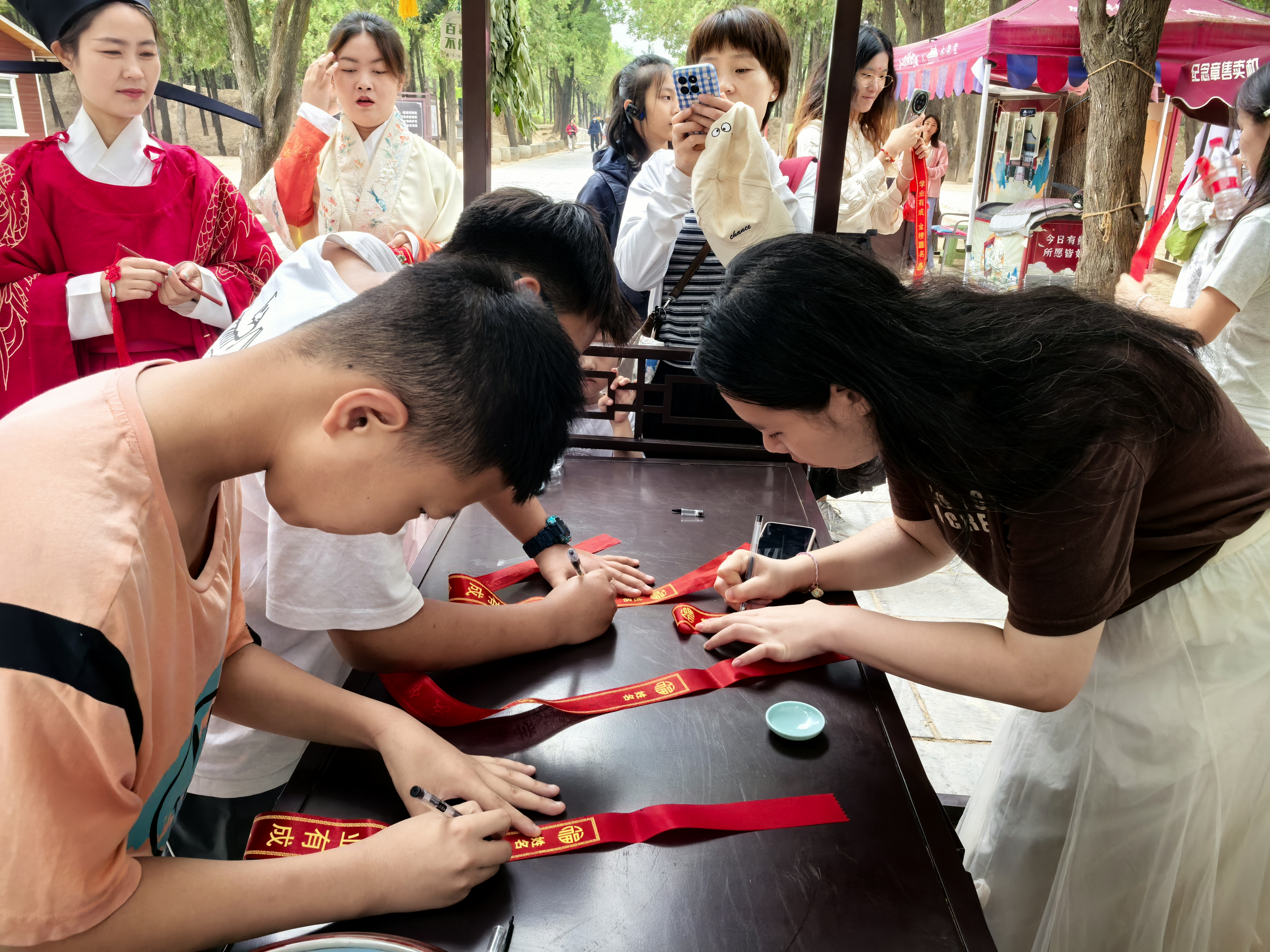 景区里,学子们依次穿过朱漆仿古龙门,门楣上垂挂用五色丝线缠绕的“状元粽”,象征着穿过龙门,平步青云;“文曲星”蘸取由雄黄、朱砂、艾草露调制的“开智丹砂”,在学子眉心点出火焰状红痣,寓意文运亨通,一举夺魁;祈福区内,景区免费为游客送上金榜题名祈福带,学子们用“文昌笔”写下心愿,古树上悬挂的祈福带随风摇曳,宛如学子们跃动的梦想,在端午的微风中等待绽放。