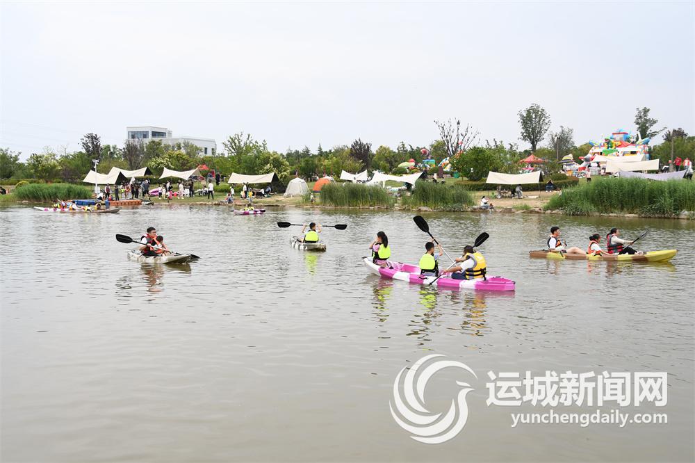 6月1日,盐湖区解州镇五龙峪河道公园,游客在划皮划艇,尽享休闲时光。