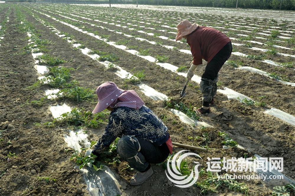 5月30日,在万荣县南张乡薛里村三白瓜种植基地内,瓜农正在为三白瓜苗整枝、压蔓、施肥、除草。