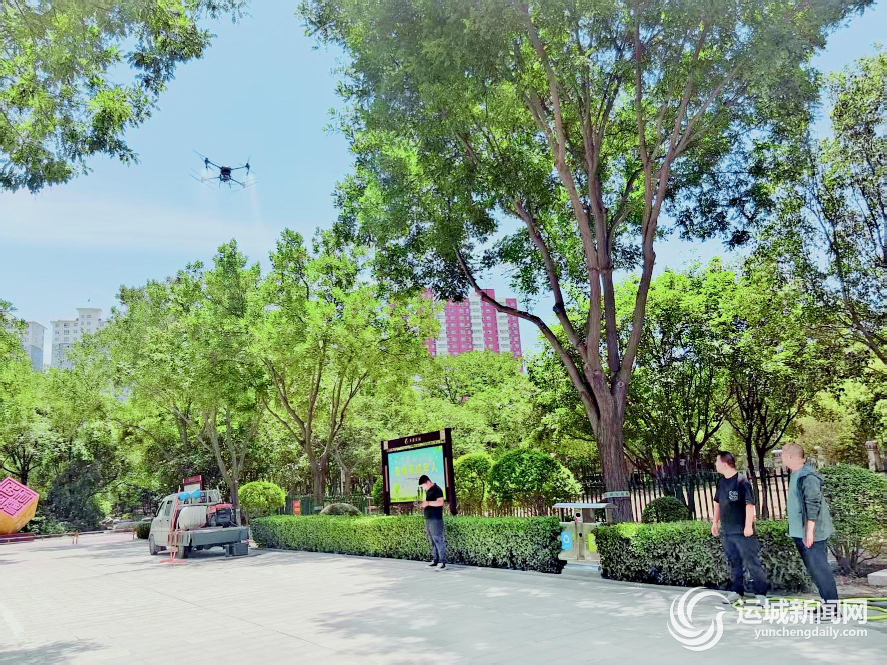 除了抗旱保苗,病虫害防治工作也在同步推进。自5月16日起,该中心针对河东街、铺安街等重点道路的苗木,启动了无人机“飞防”作业。在专业技术人员的操作下,无人机在空中穿梭,将防治药剂均匀地喷洒在树木顶端和密集冠层,为树木搭起病虫害“防护罩”。此外,为防治蚜虫、红蜘蛛等病虫害,该中心各片区管护部园林工人还利用小型打药车进行精准防治,确保苗木能够健康生长。