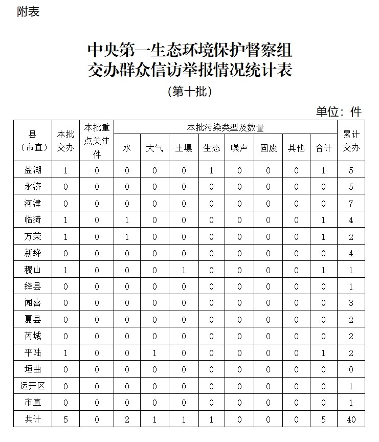 2025年6月7日,中央第一生态环境保护督察组向我市交办的第十批信访举报件,共5件;交办举报件中重点关注件0件。按区域和部门划分,盐湖区1件、万荣县1件、稷山县1件、临猗县1件、平陆县1件。本批转办的信访件,涉及生态环境问题5个,其中,水污染问题2个、大气污染问题1个、土壤污染问题1个、生态破坏问题1个。