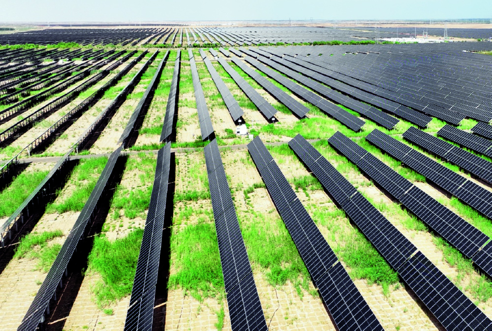 近日拍摄的内蒙古巴彦淖尔市磴口县境内的乌兰布和沙漠光伏治沙项目(无人机照片)。