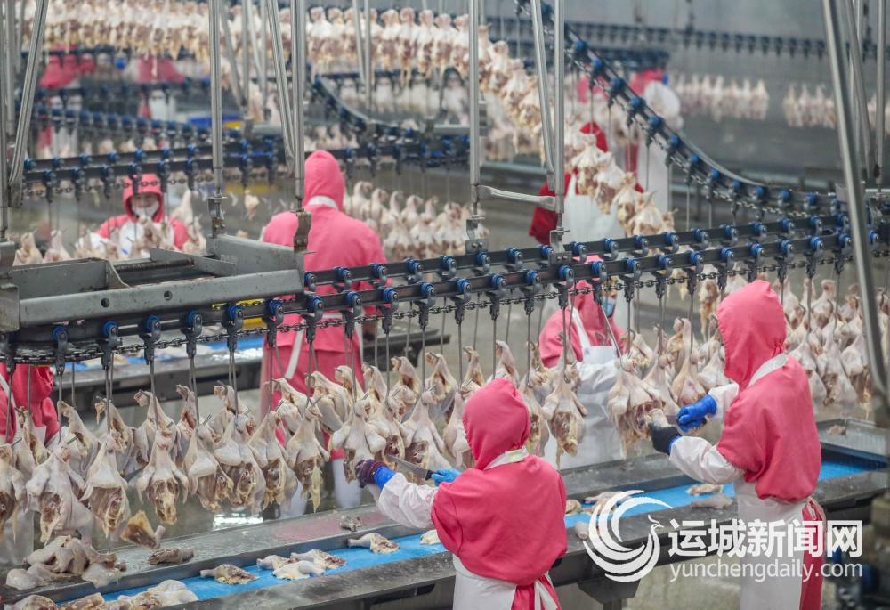 永济市大象农牧有限公司生产车间内,工人们在加工肉鸡。