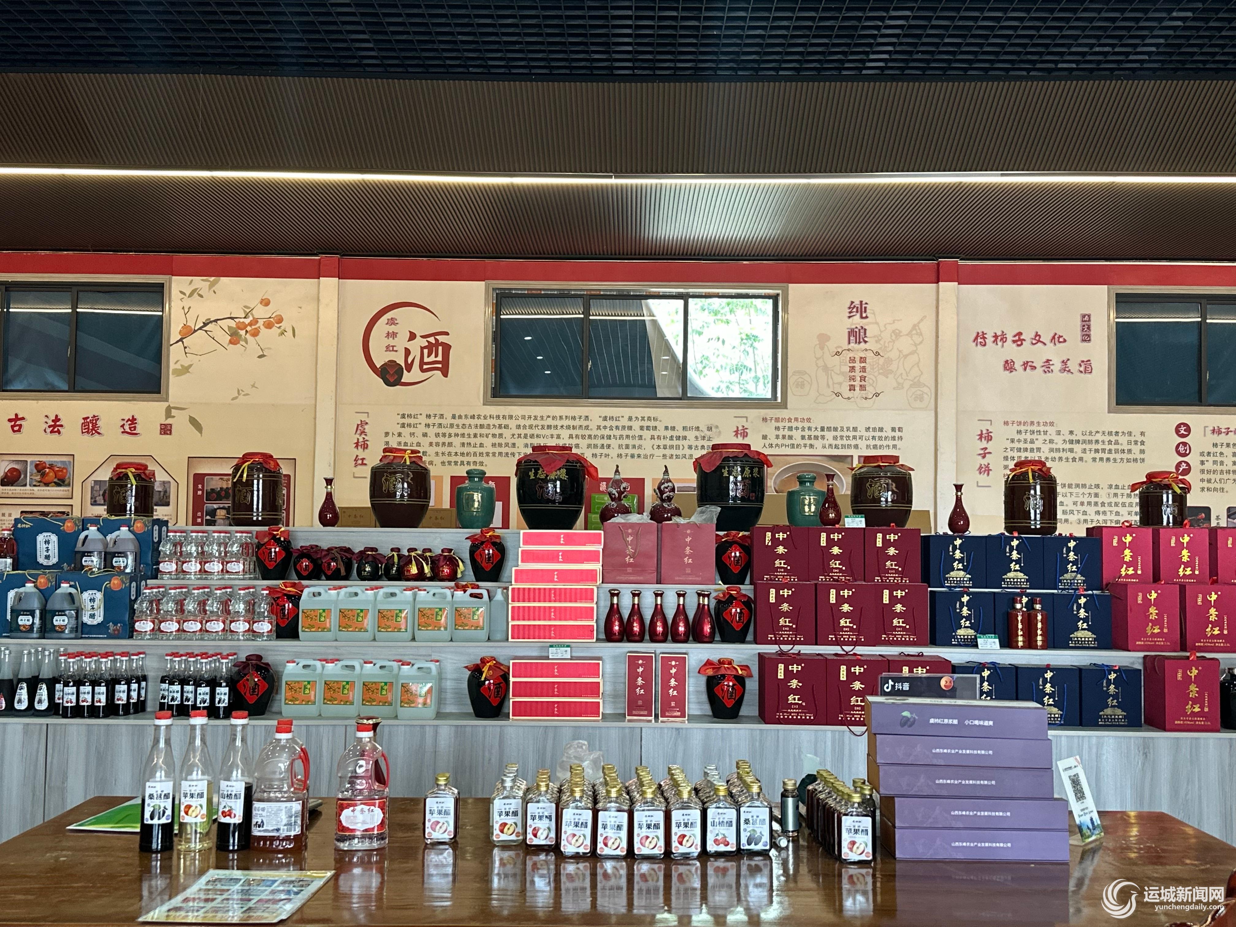 如今,坦朝村的中条红牌柿子酒、虞柿红柿子醋及柿叶茶已经通过国家SC认定,正式面世。在宽敞的展示厅里,柿产品琳琅满目。在恒温13摄氏度的酒窖里,已被认购的酒坛“鳞次栉比”。柿叶茶包装精美、柿子醋口感绵长、酒产品更是清香扑鼻,坦朝村的“柿”业一片兴旺。