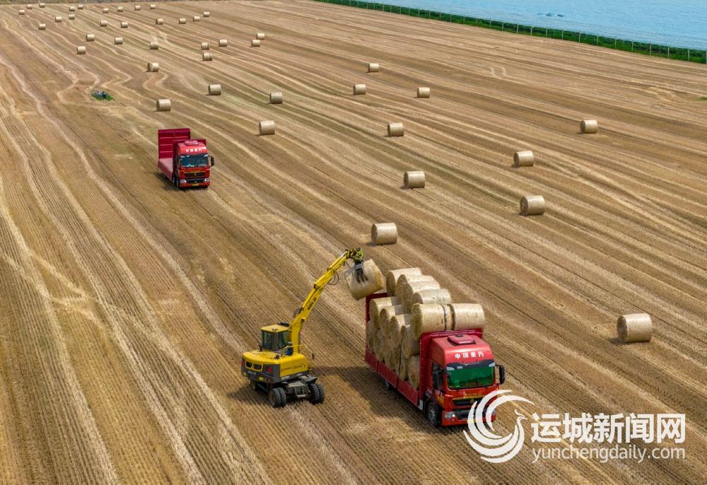 6月8日,万荣县裴庄镇黄河滩涂上,万荣致远种植专业合作社开展小麦秸秆打捆收集作业。